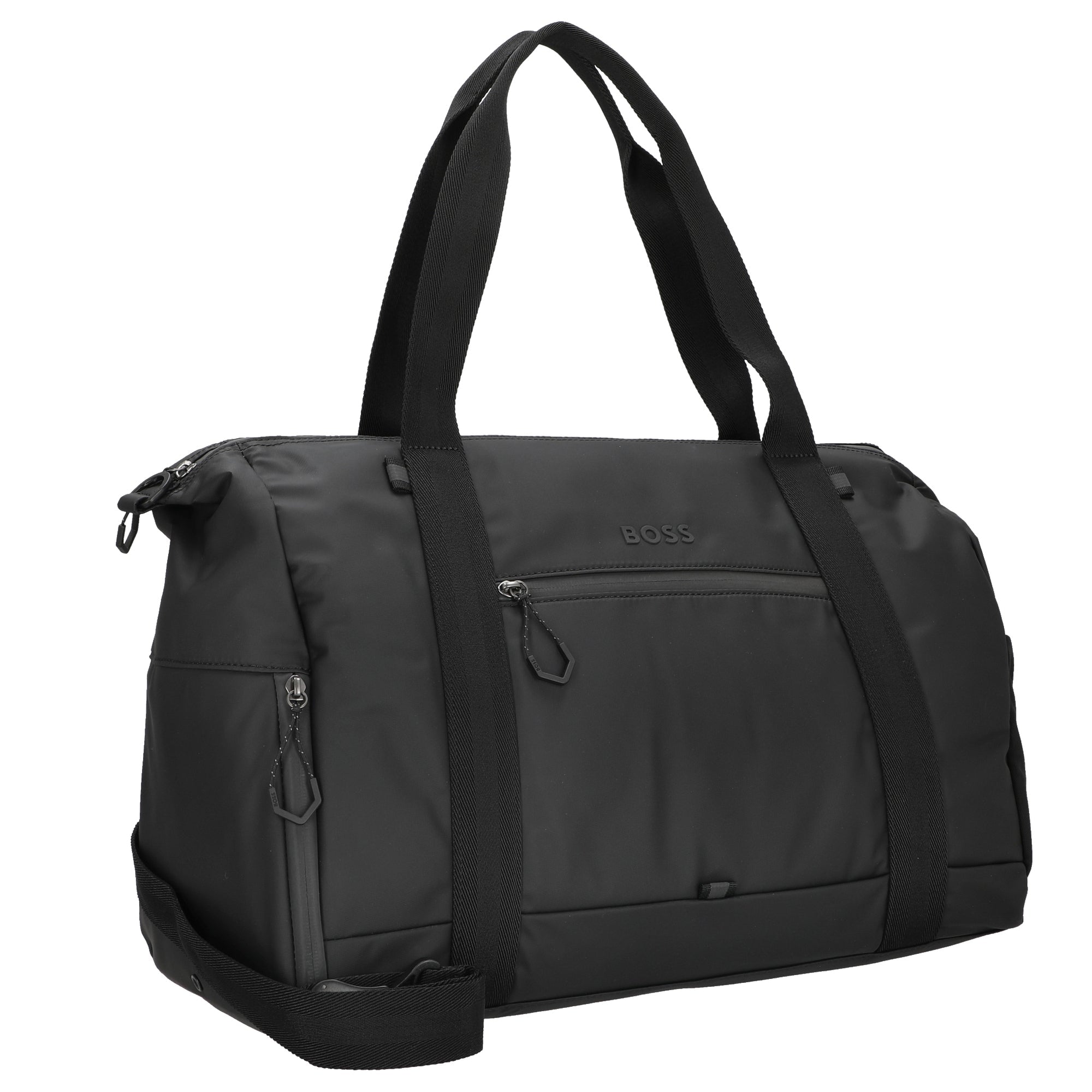 The BOSS Men Stenson Weekender in classic black is a functionally designed travel bag with compact dimensions of 45 cm and a volume of 35 liters. Weighing only 1 kilogram, this bag is ideal for short trips or weekend getaways.