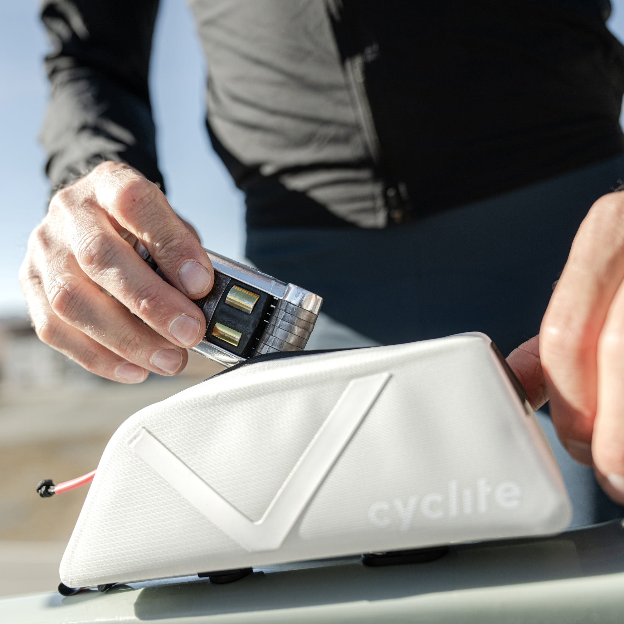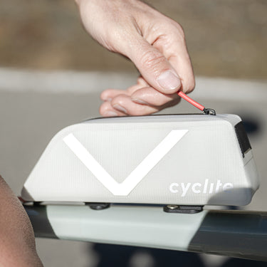 The Cyclite Top Tube Bag Nano in subtle light grey is a compact bike bag designed for bikepacking enthusiasts who value functionality and low weight.
