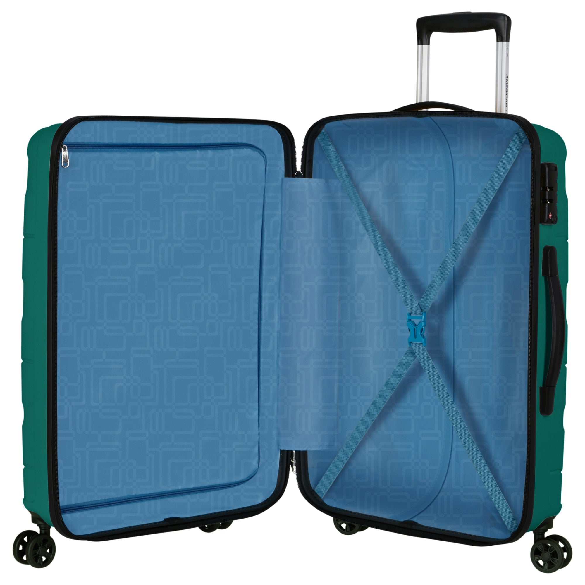 A sturdy trolley from American Tourister, characterized by its functional features and sporty design in the color sporty teal. With a height of 67 cm and a volume of 63 l, it offers ample space for your travel essentials.