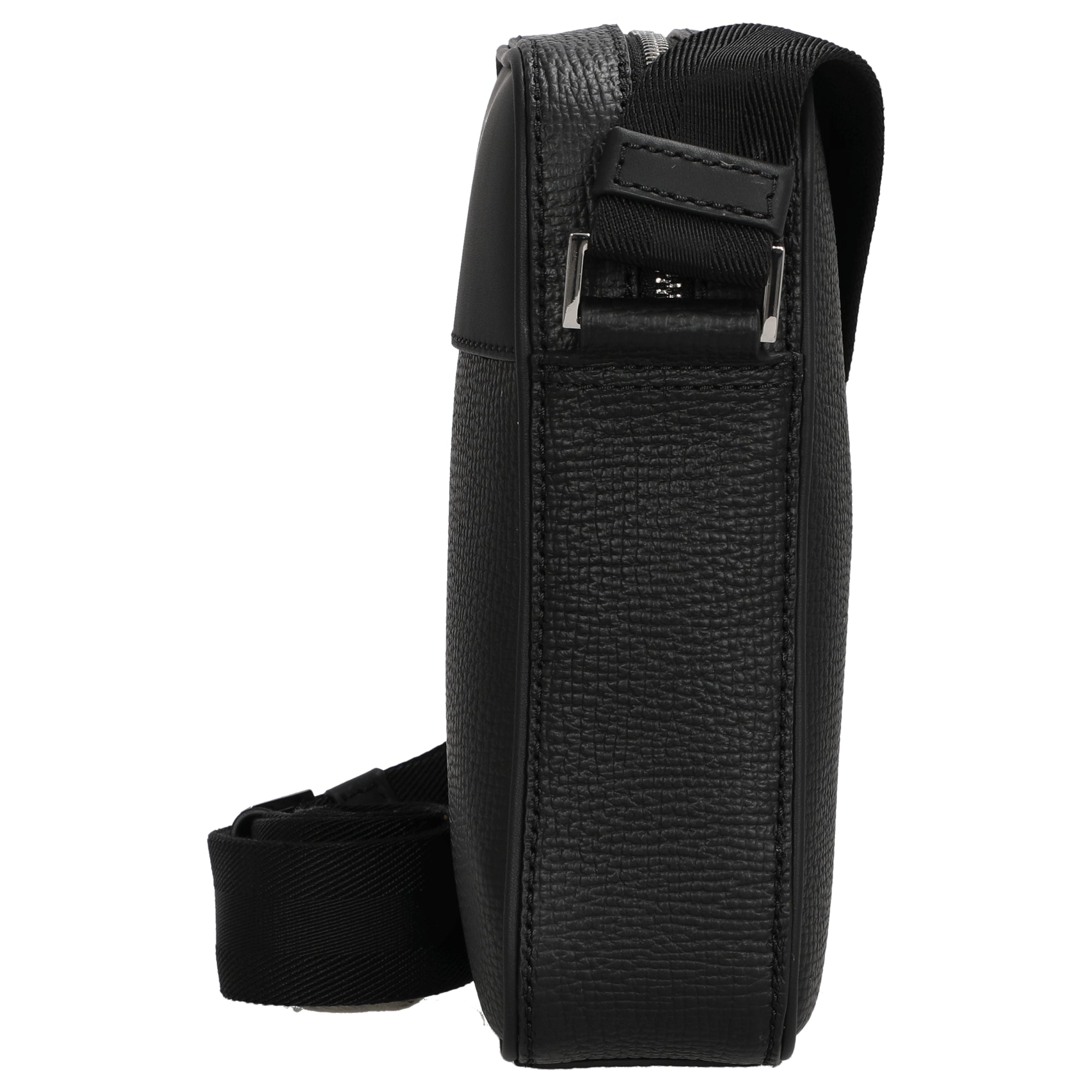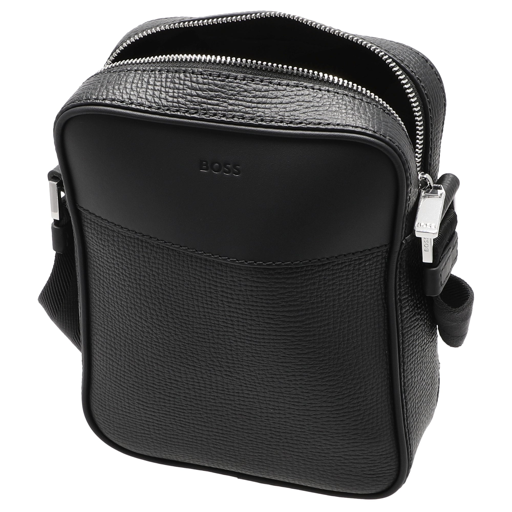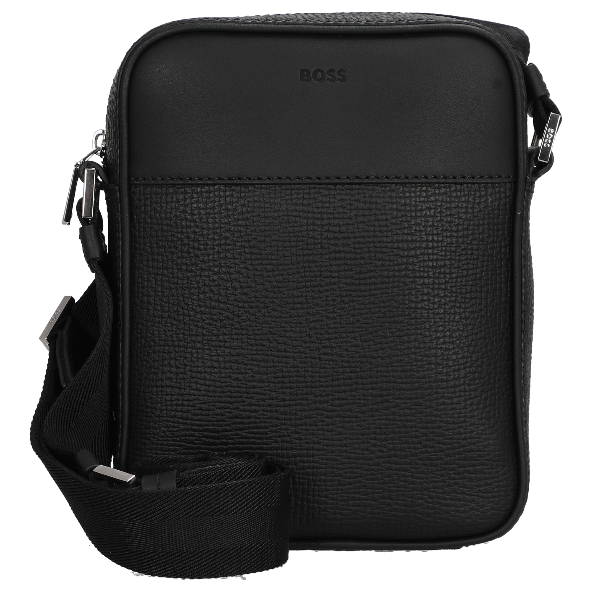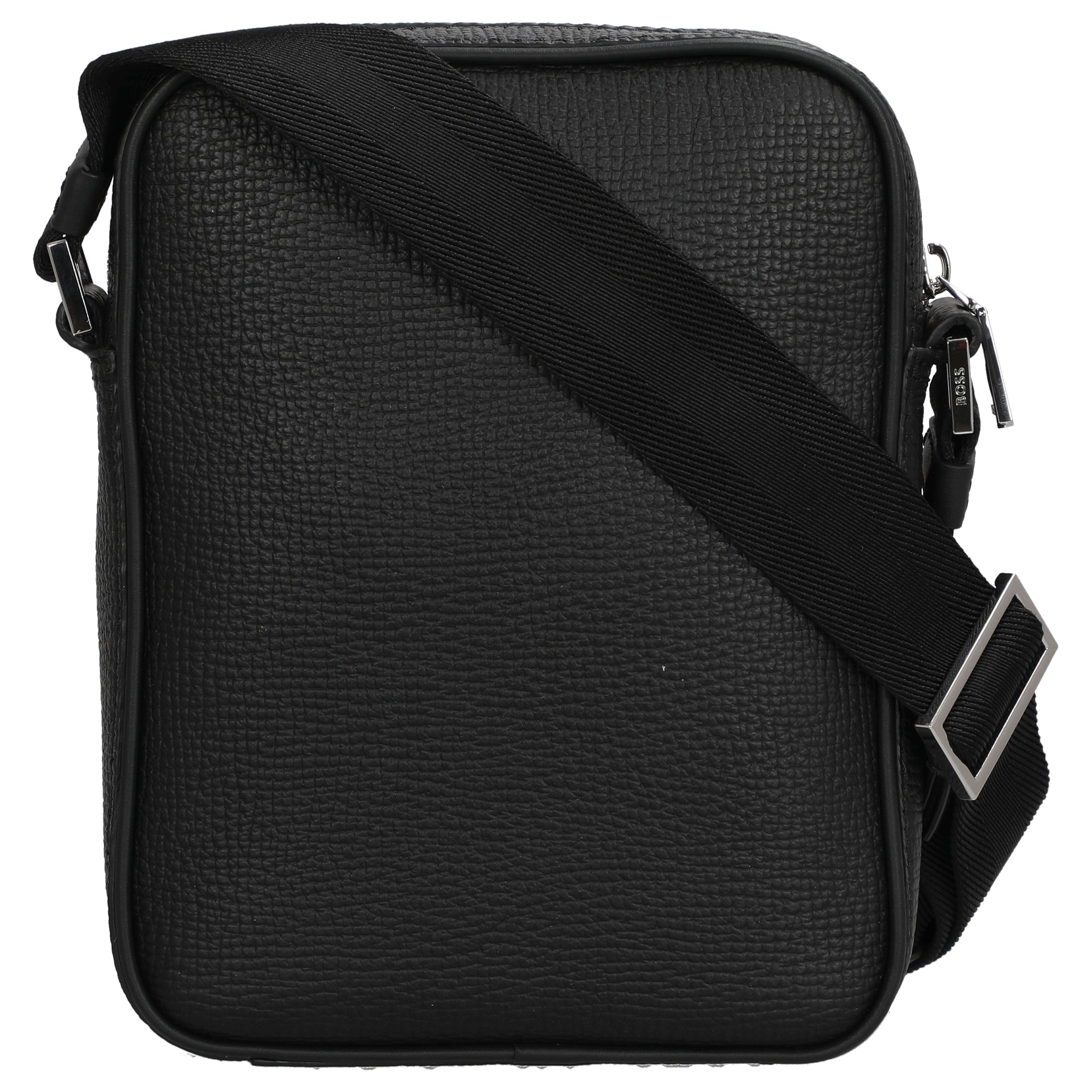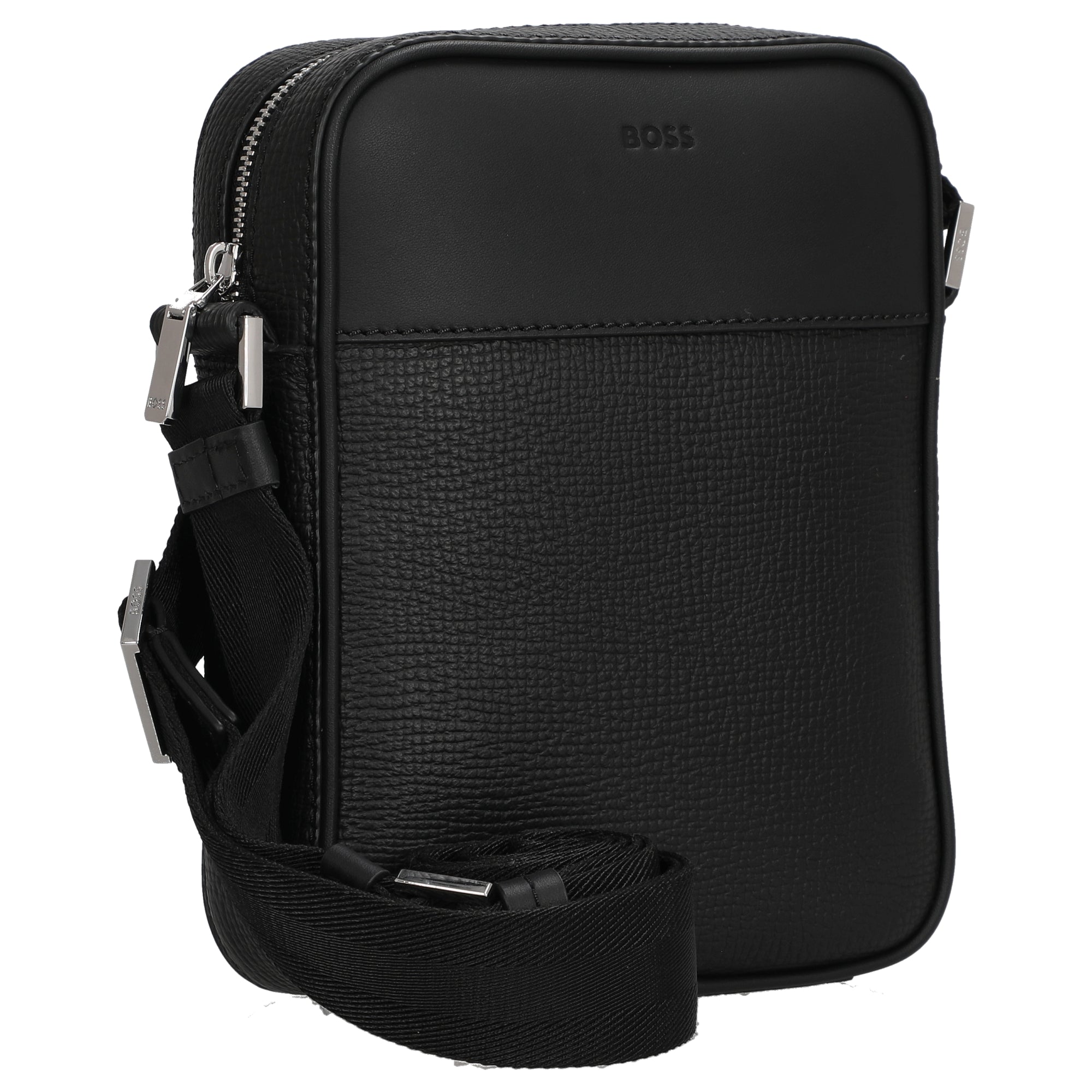 The BOSS New Crosstown crossbody bag in black is a stylish companion for women who value timeless elegance and high-quality craftsmanship. The combination of smooth and textured cowhide leather gives the bag a sophisticated look, perfectly complemented by the subtle logo detail and shiny silver-colored accents.