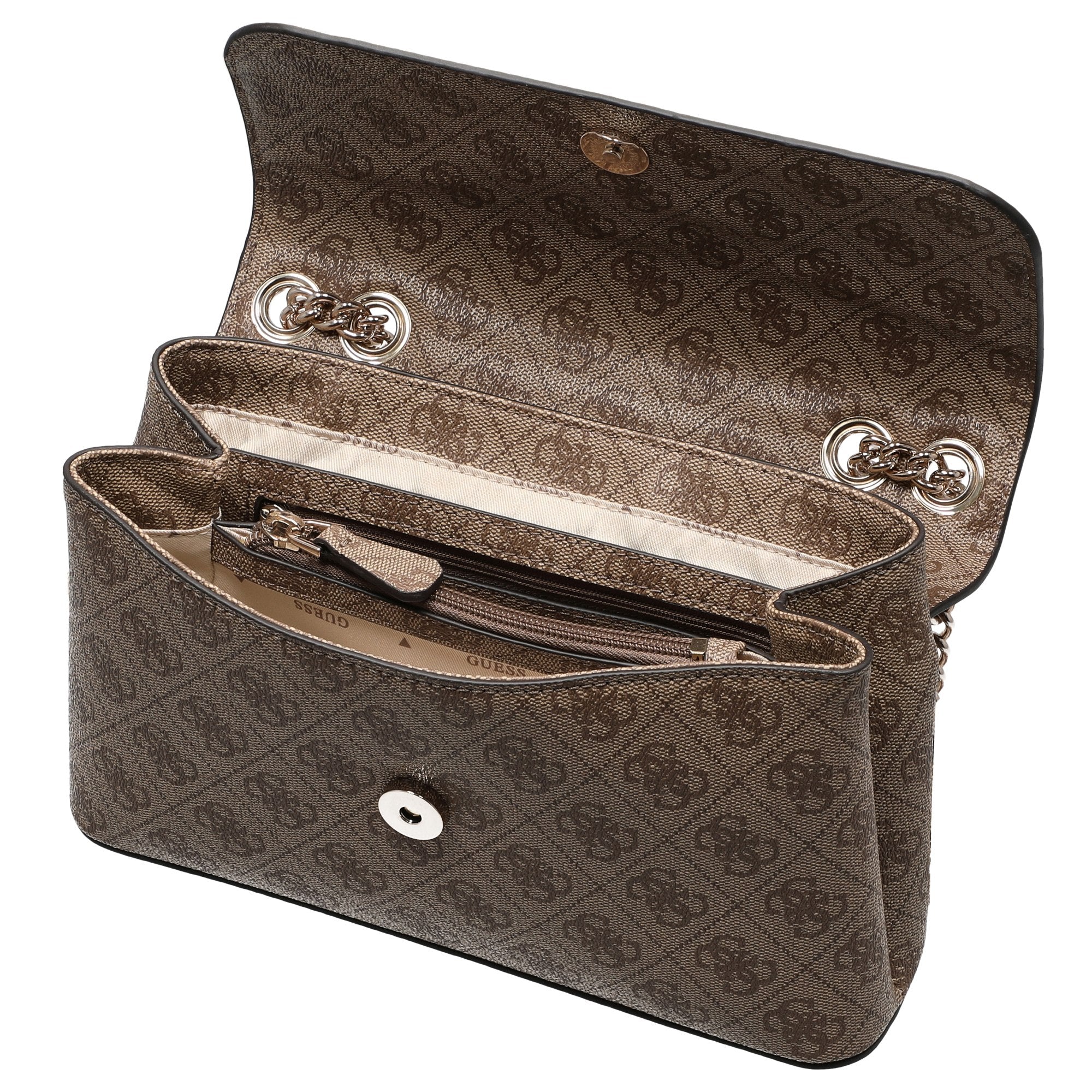The GUESS Eco Erica Convertible Xbody is an elegant shoulder bag in the trendy latte color with logo pattern, designed to accompany fashion-conscious women in everyday life. Its charming design combines style with thoughtful functionality, allowing you to always keep your essentials neatly and within easy reach.