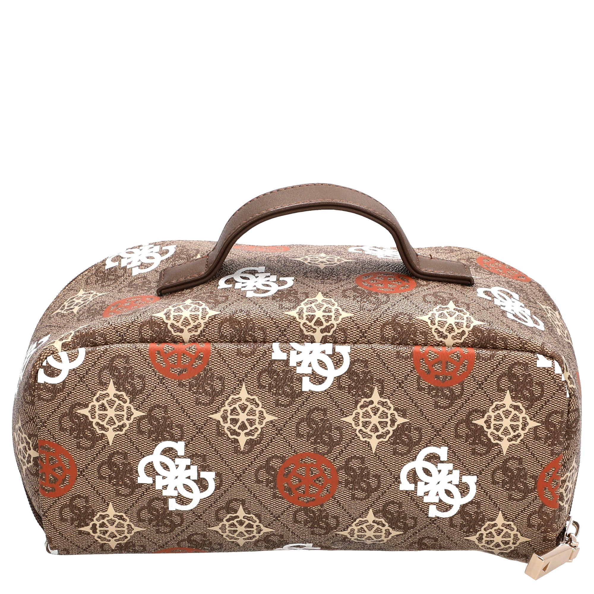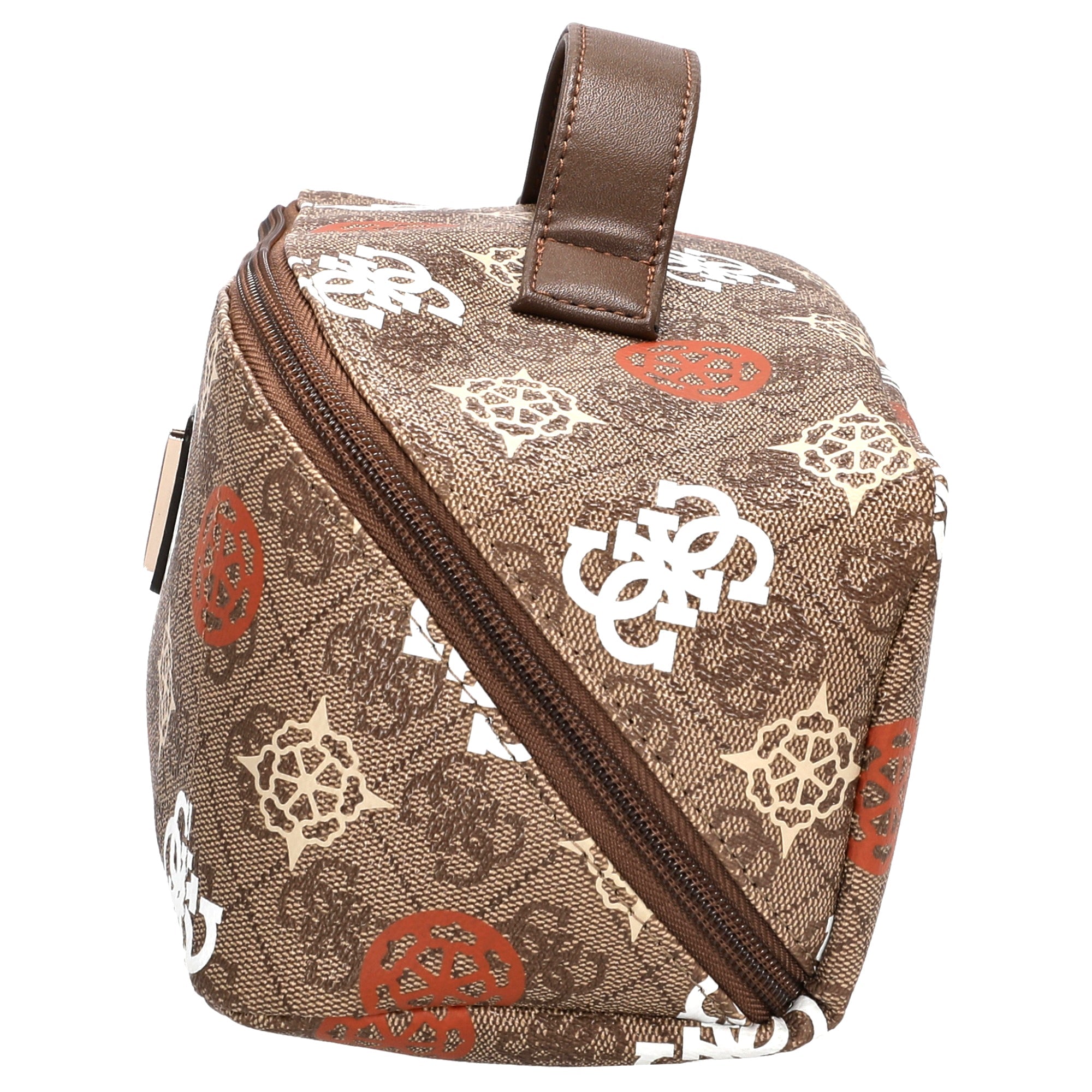 The Guess Eliette Logo Large Toiletry Bag in latte logo/ginger is the perfect companion for style-conscious travelers who value both function and design.