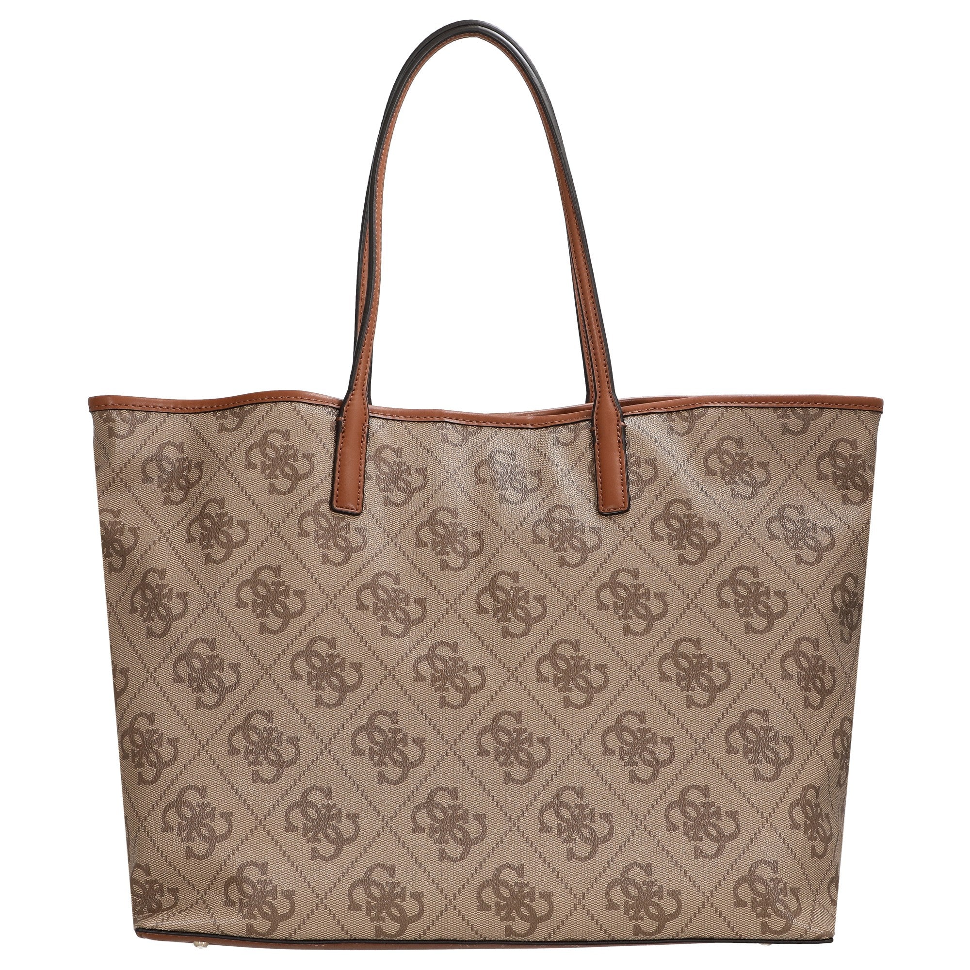 The GUESS Erenia Large 2 in 1 Tote in the elegant latte color combines fashionable chic with thoughtful functionality. This spacious shopper impresses with its distinctive logo design and the harmonious blend of light and warm brown tones, making it versatile to pair with various outfits.