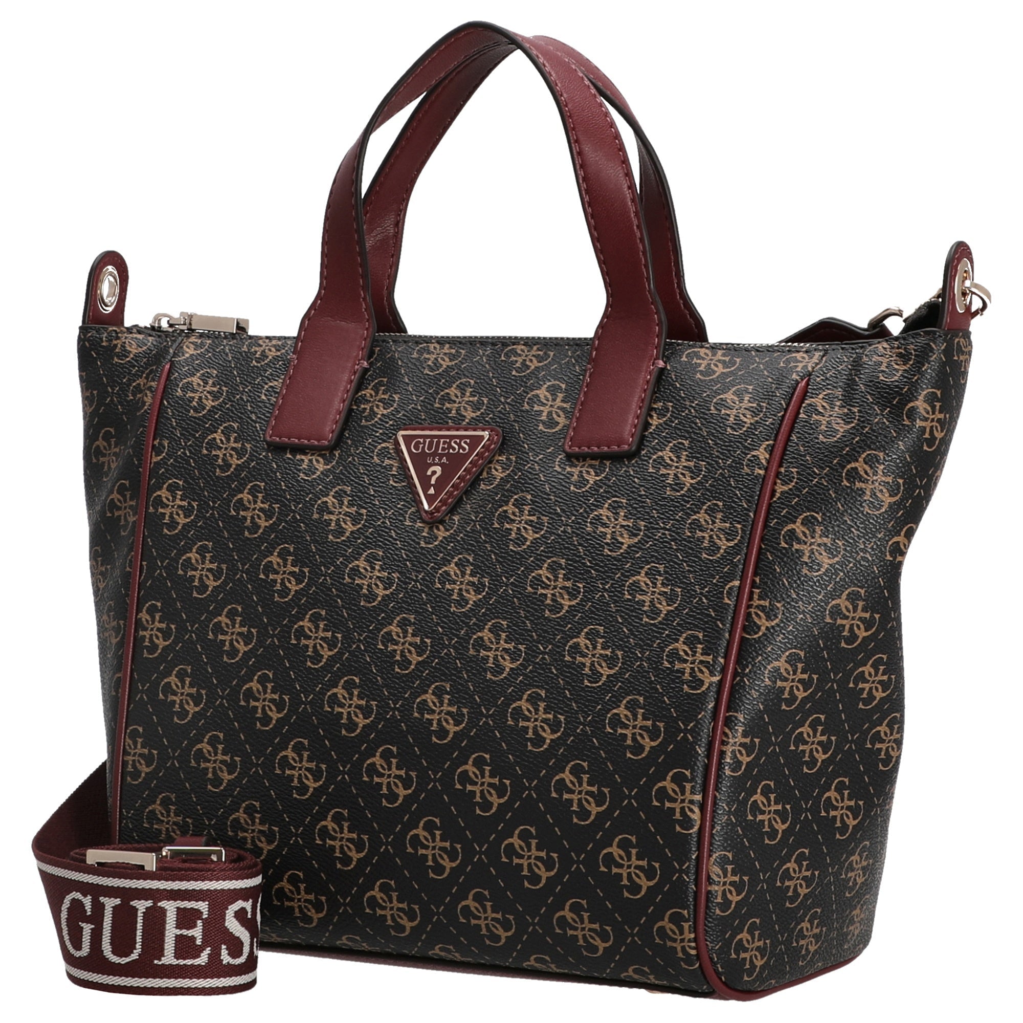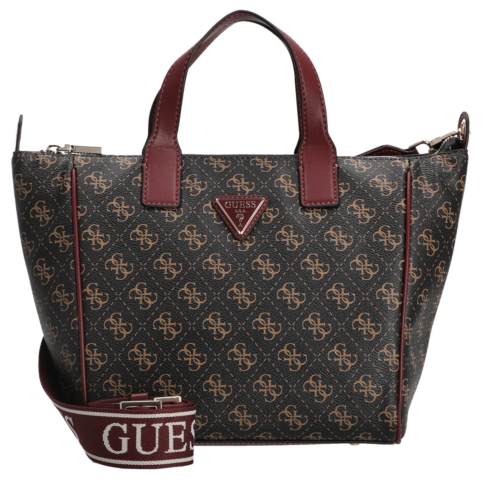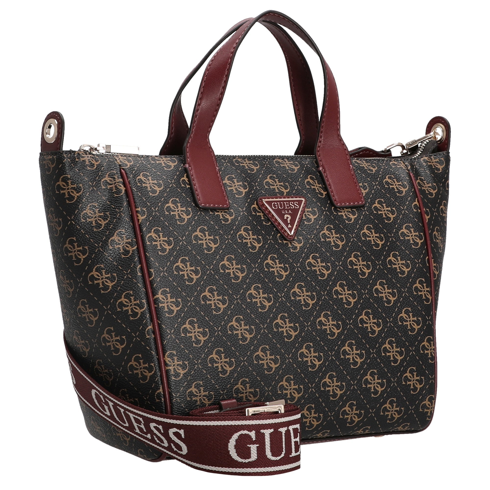 With the Guess Follie Small Tote in the elegant brown logo color, you set fashionable accents in everyday life. This compact shopper combines stylish design with practical functionality and reliably accompanies you on all your activities.