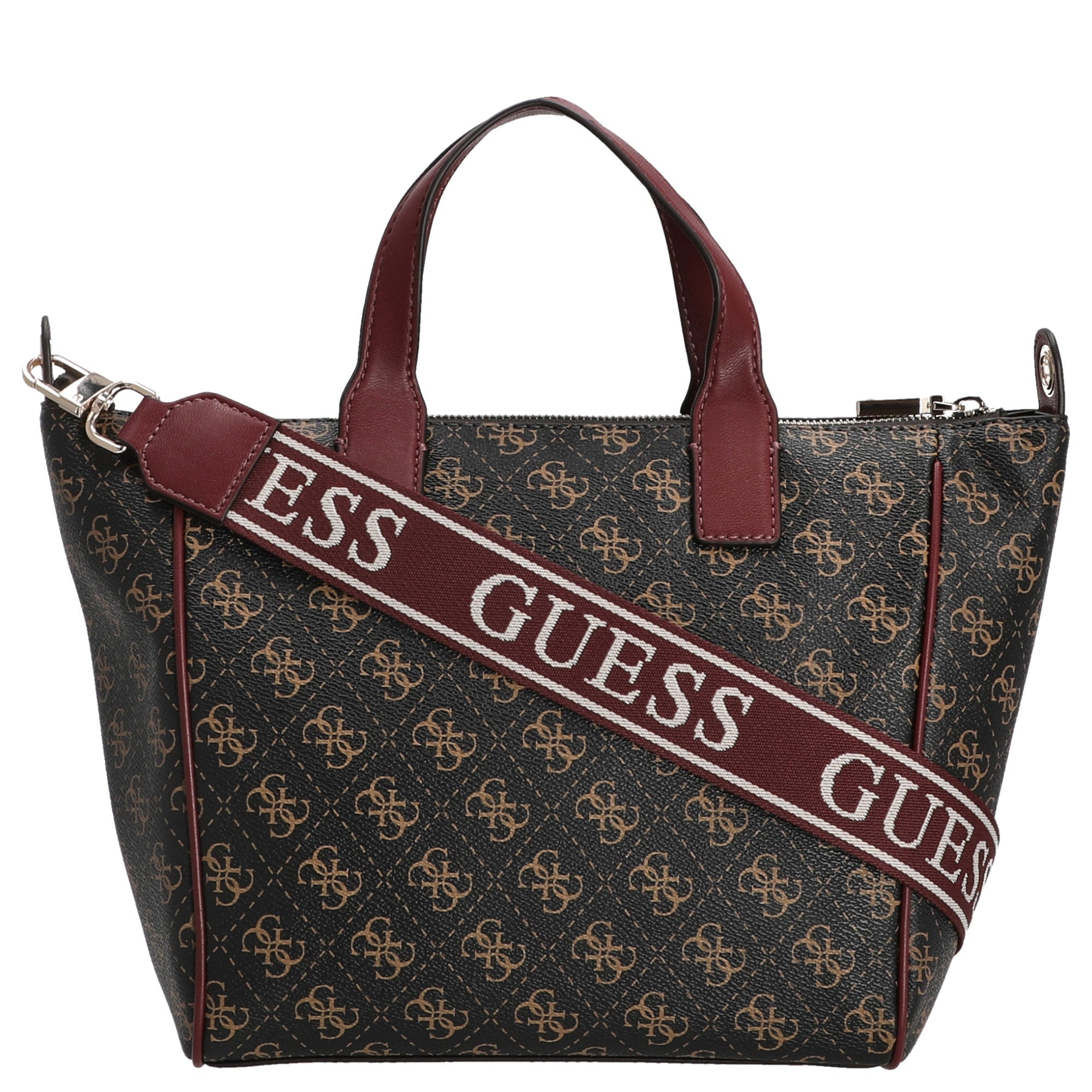 The Guess Follie Small Tote in brown logo is the perfect companion for fashion-conscious women who value style and function.