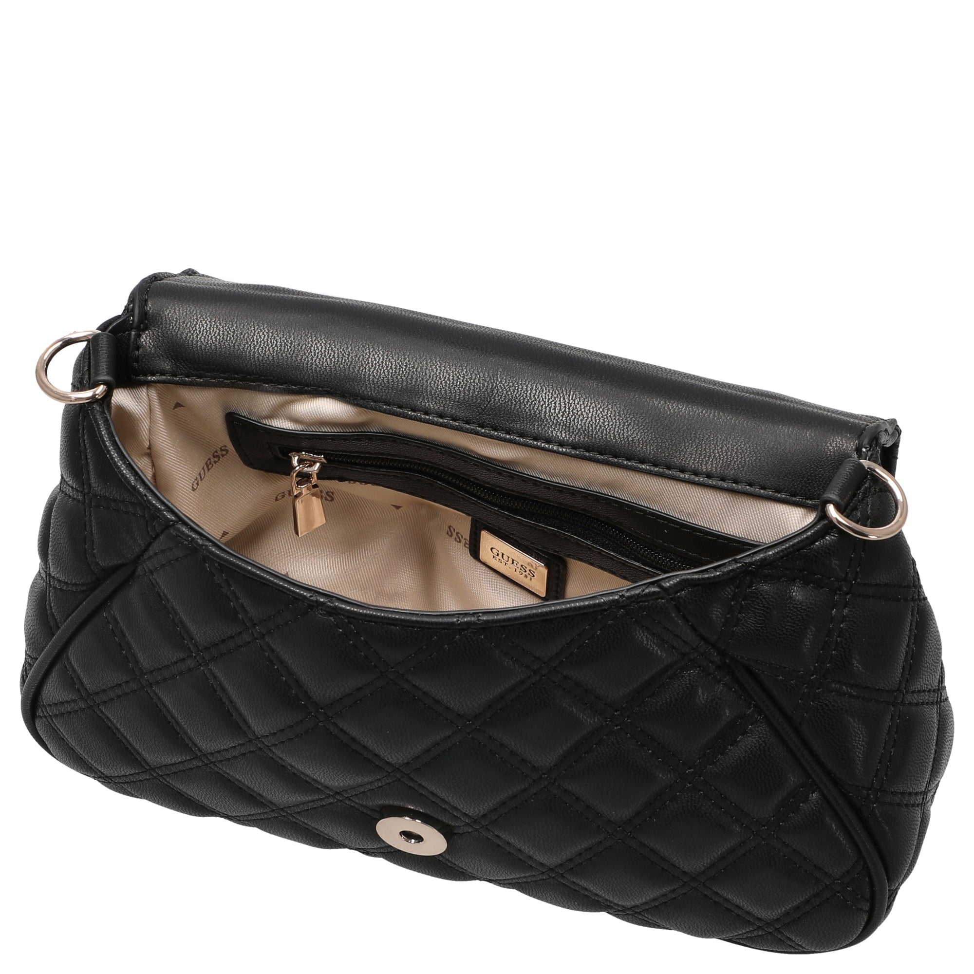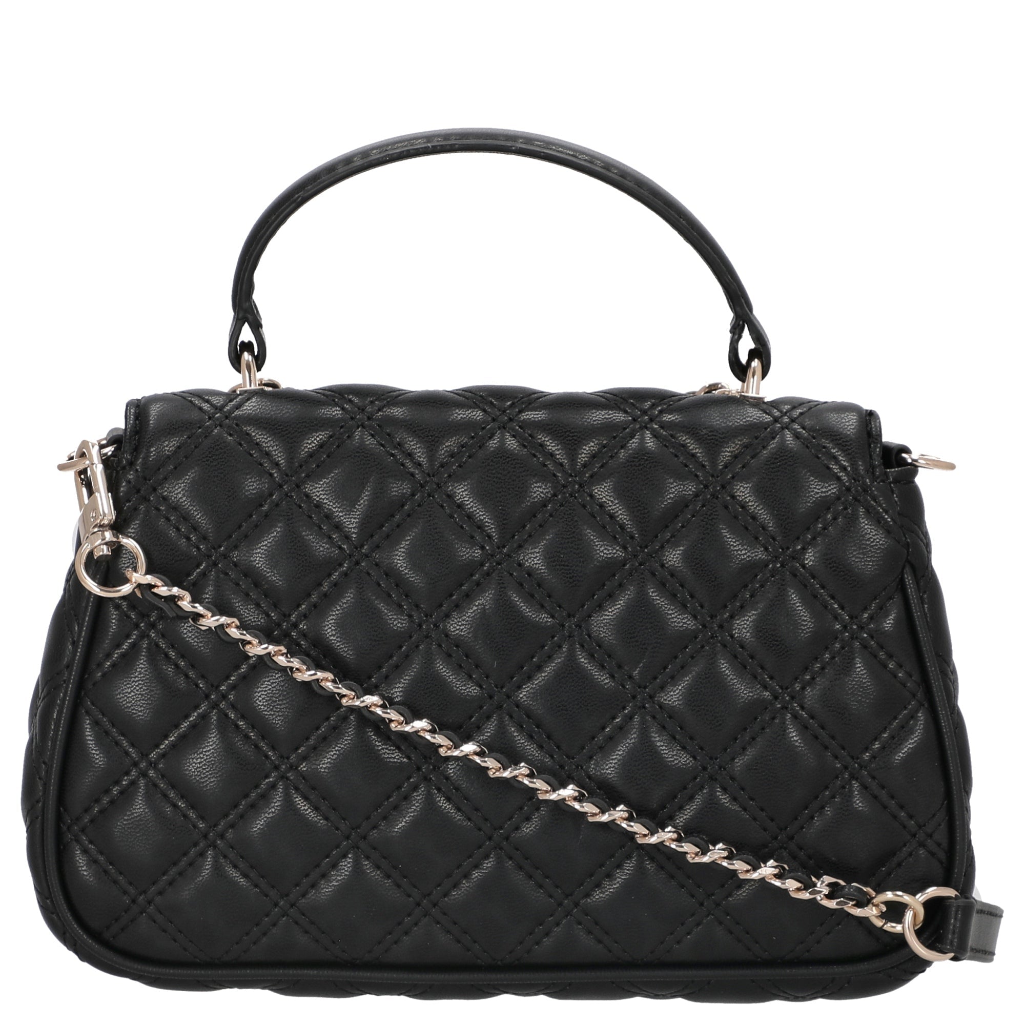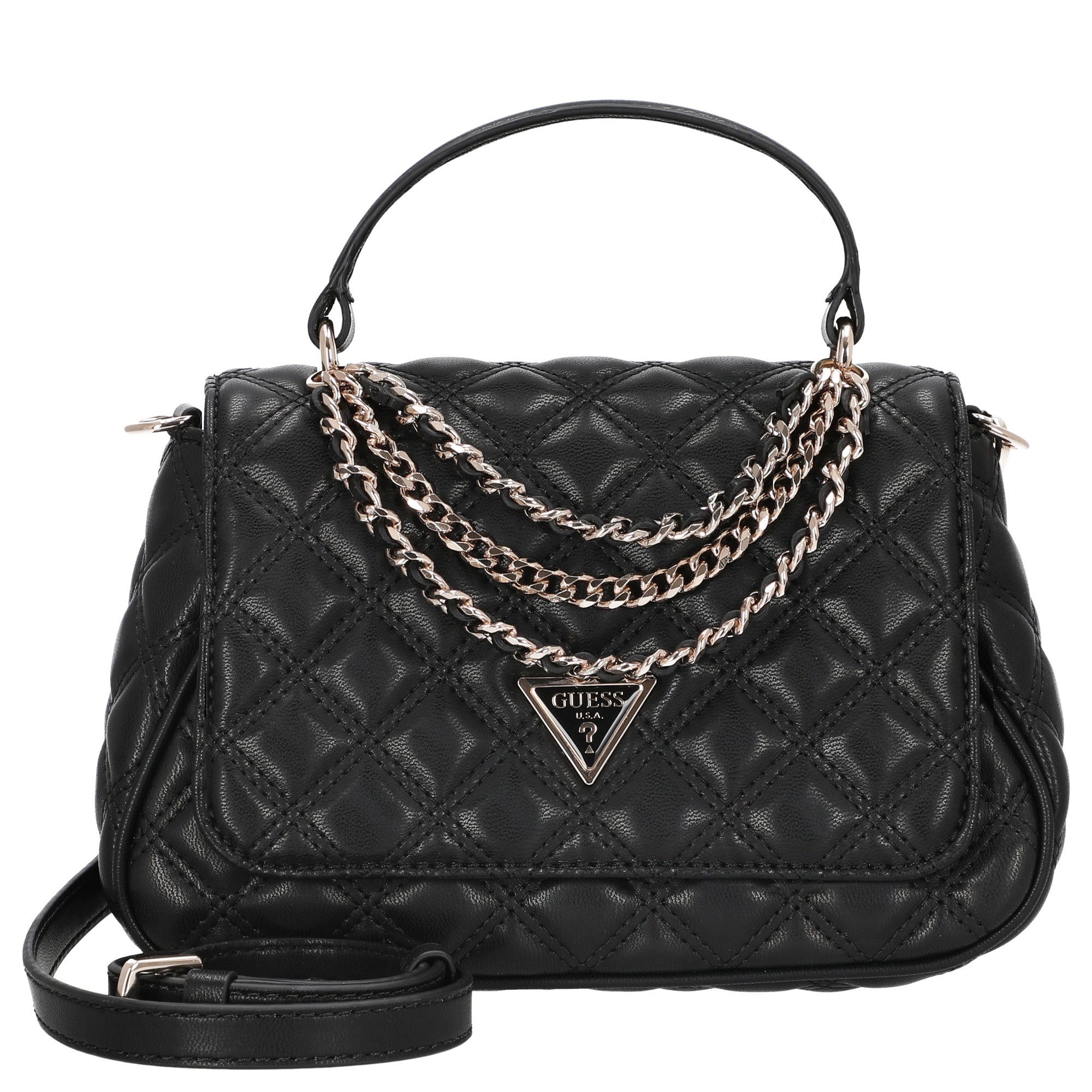 The Guess Giully II Top Handle Bag in black combines elegant style with urban flair. The quilted pattern and decorative metal chains add fashionable accents that elevate any outfit – perfect for women who appreciate attention to detail.