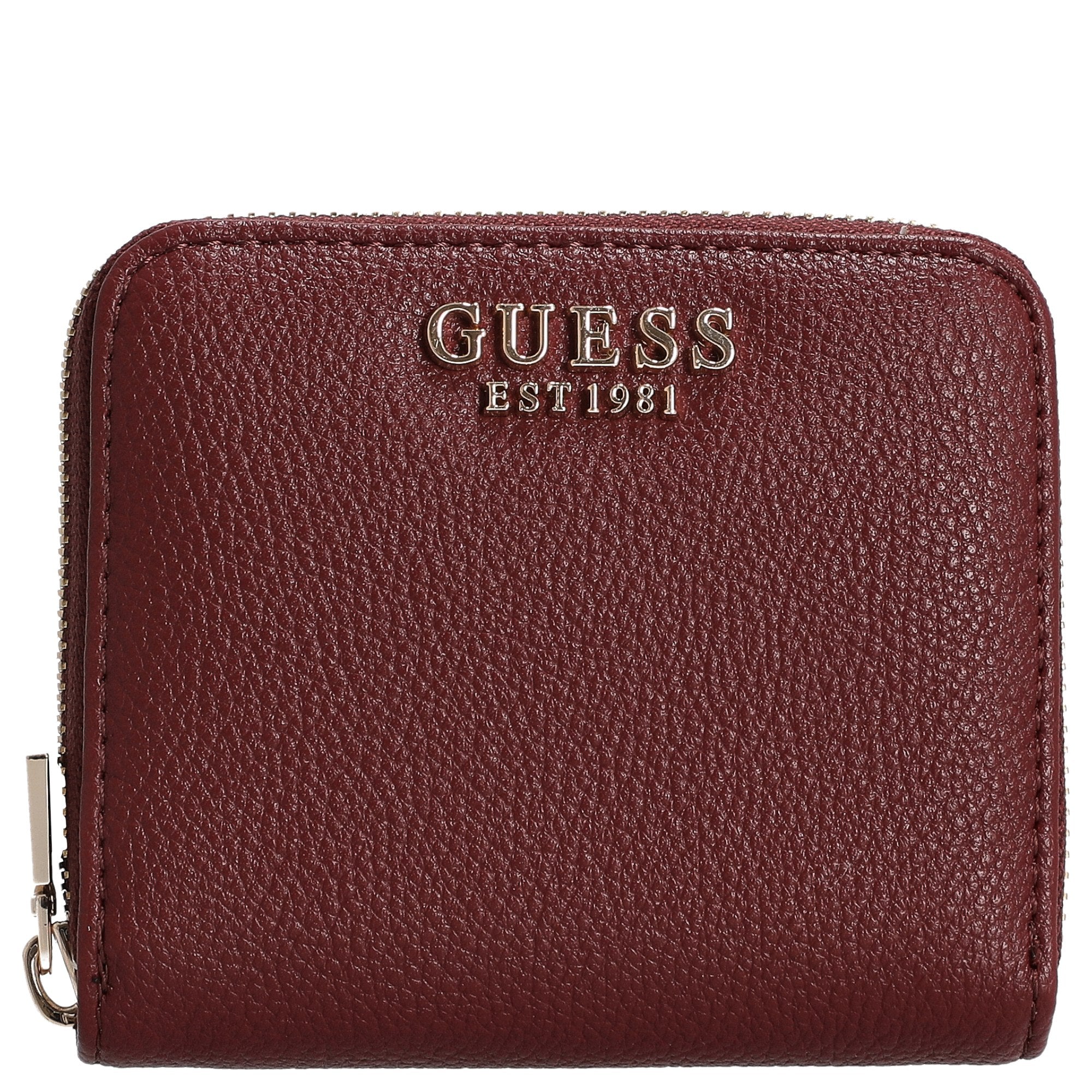 The Guess Laurel II SLG Small Zip Around Wallet in black impresses with an elegant design and practical details. The fine faux leather with a subtle grain texture gives the wallet a high-quality look, stylishly complemented by light gold-colored metal accents.