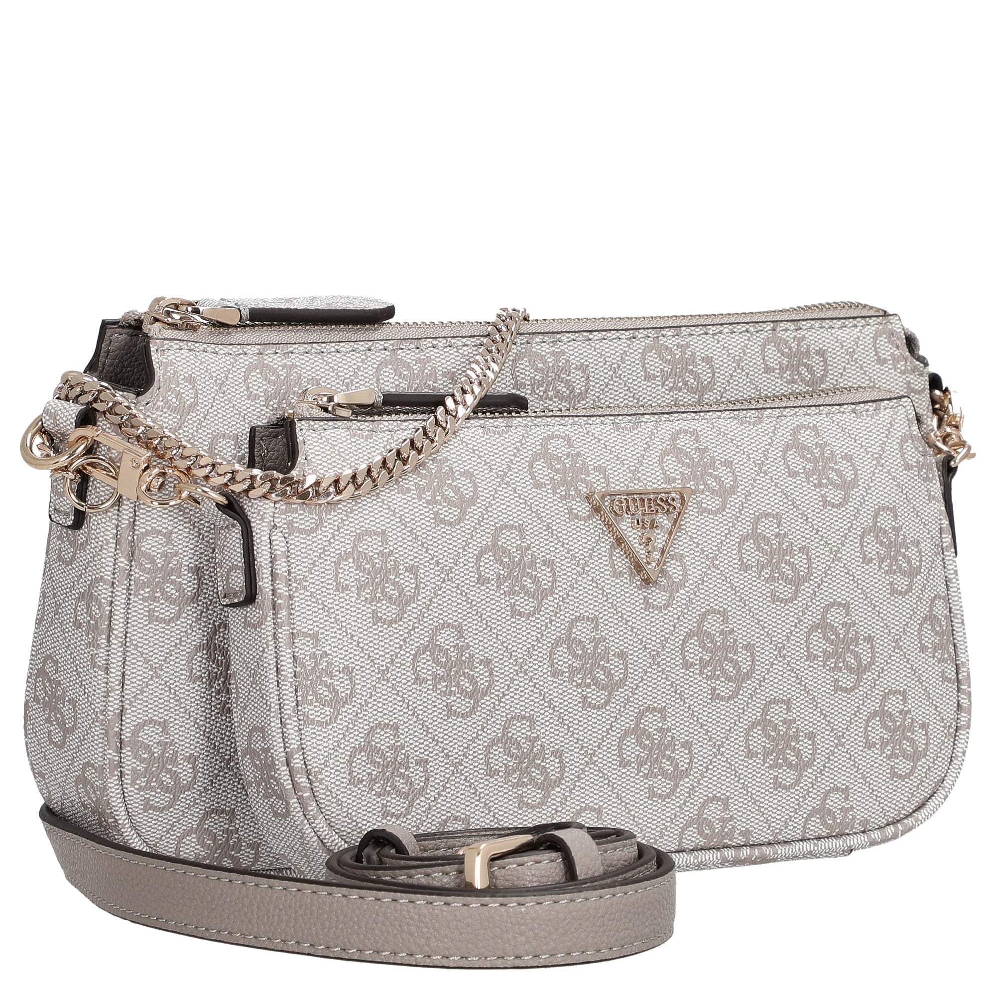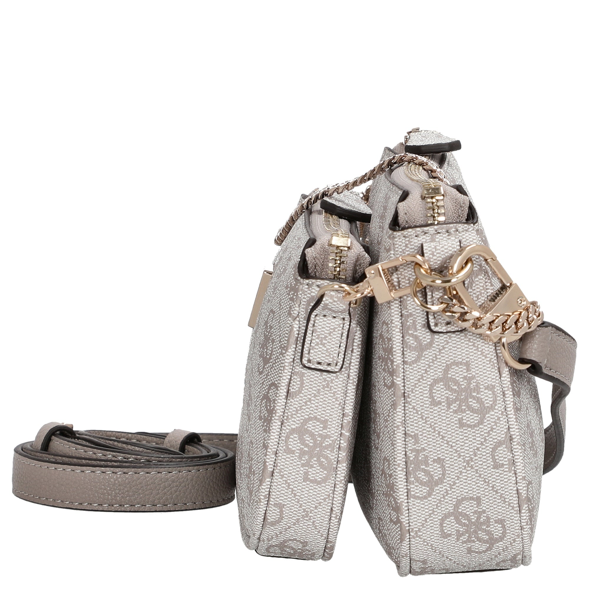 The GUESS Noelle II Double Pouch Crossbody Bag in elegant dark taupe logo is the perfect companion for fashion-conscious women who value style and versatility. This set of two compact bags combines modern design with practical functionality, ensuring an effortless look—whether for everyday use or special occasions.