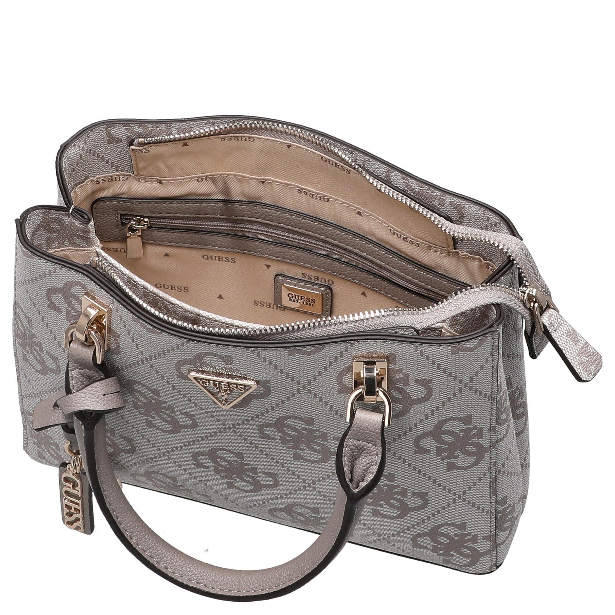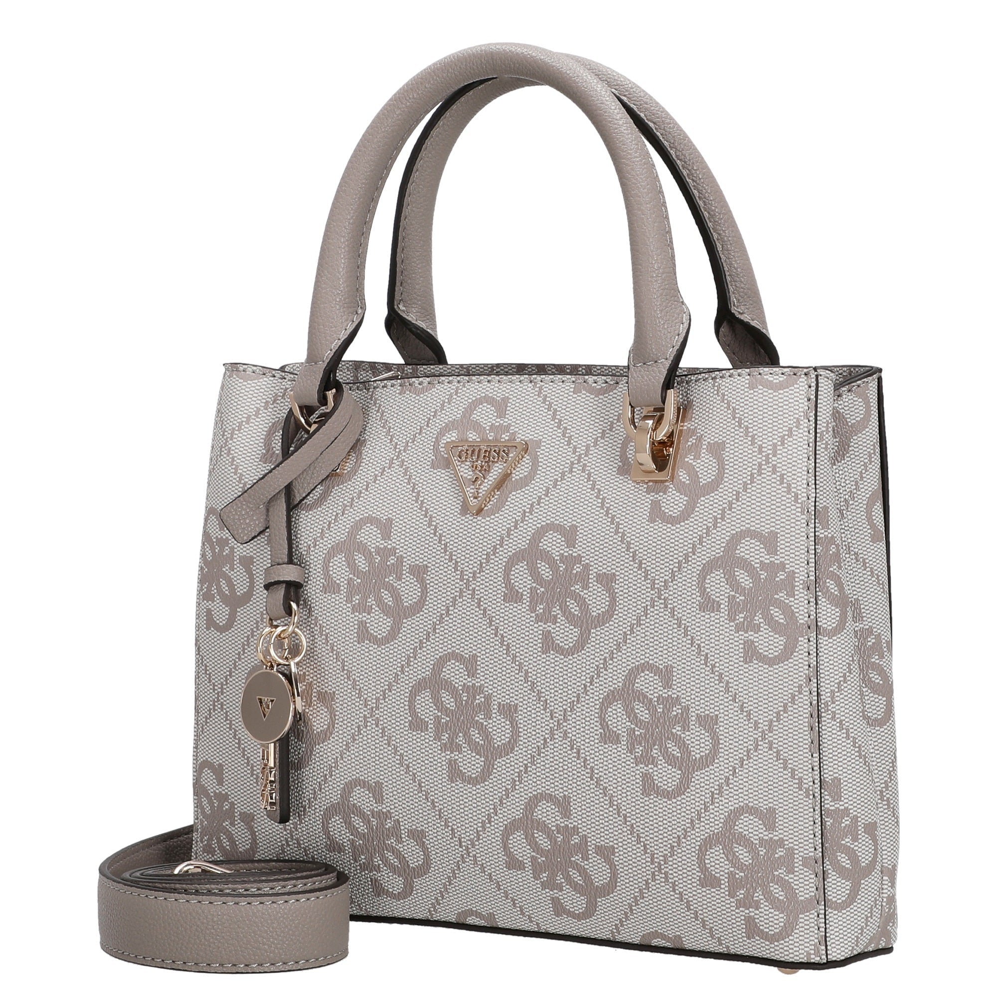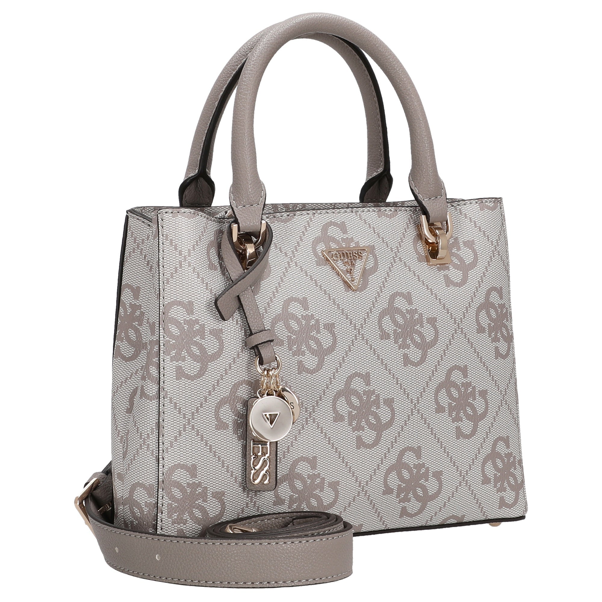 The Guess Noelle II Top-Handle Bag in dark taupe impresses with its elegant, timeless design that effortlessly complements any look. The finely crafted logo on the front gives the bag a subtle, high-quality brand presence, while the charming charm adds a personal touch.