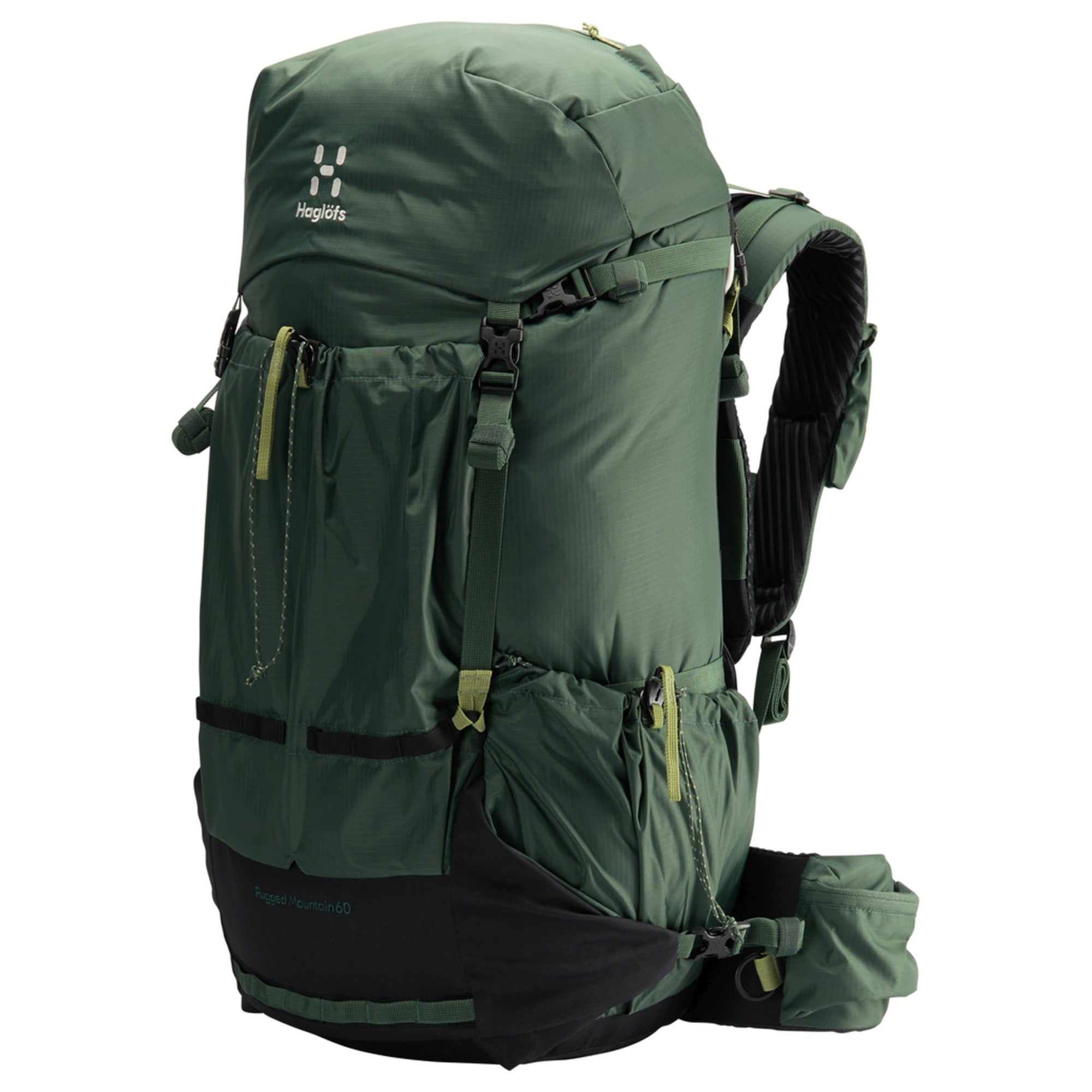 Discover the Haglöfs Rugged Mountain 60 trekking backpack in the stylish color fjell green/true black. This backpack combines functionality and sustainability, made from recycled main materials. It has been specifically designed to minimize the use of non-recyclable stretch materials.