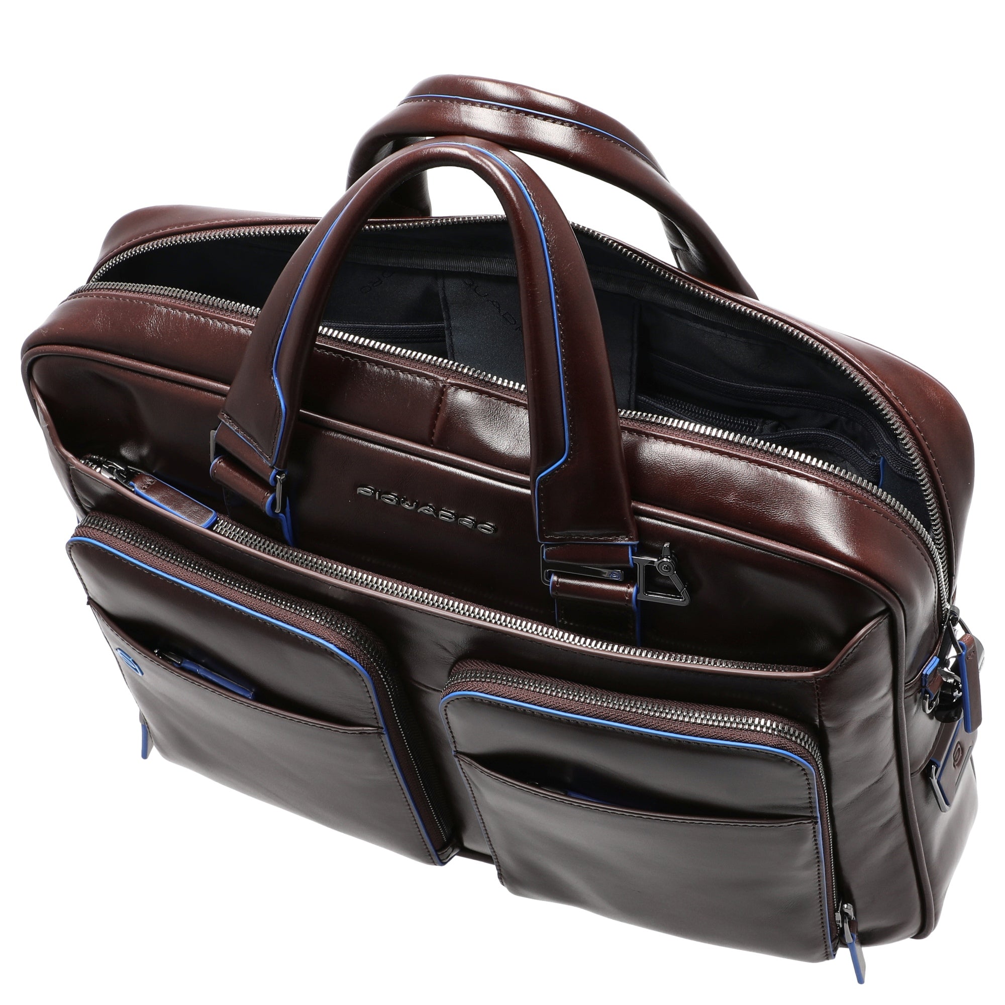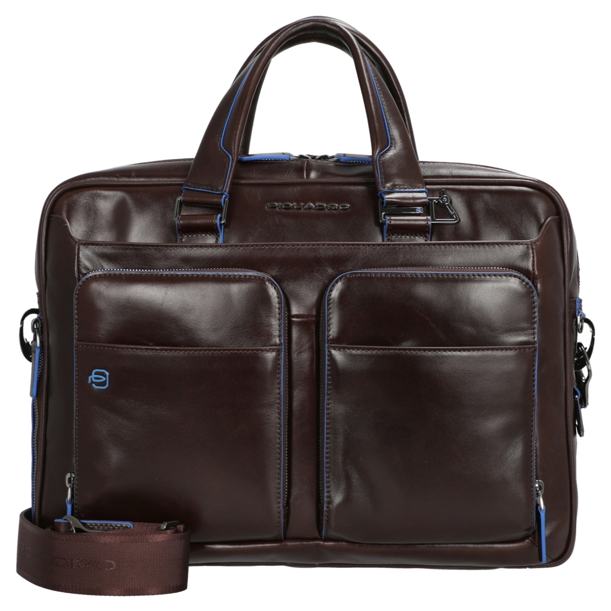 The Piquadro Blue Square Briefcase in elegant mahogany stands out with its high-quality calf leather featuring traditional mineral tanning, which preserves the natural beauty of the leather over time. The clearly defined edges are hand-dyed in a fresh light blue, giving the bag a modern business character.