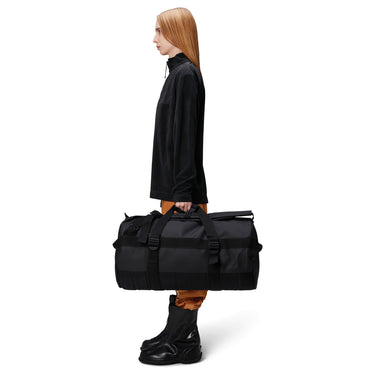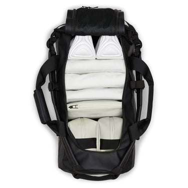 Discover the stylish black travel bag from the Texel collection by Rains, perfectly suited for adventures in any weather. This bag combines functionality with modern design and is ideal for travel, outings, or everyday use.
