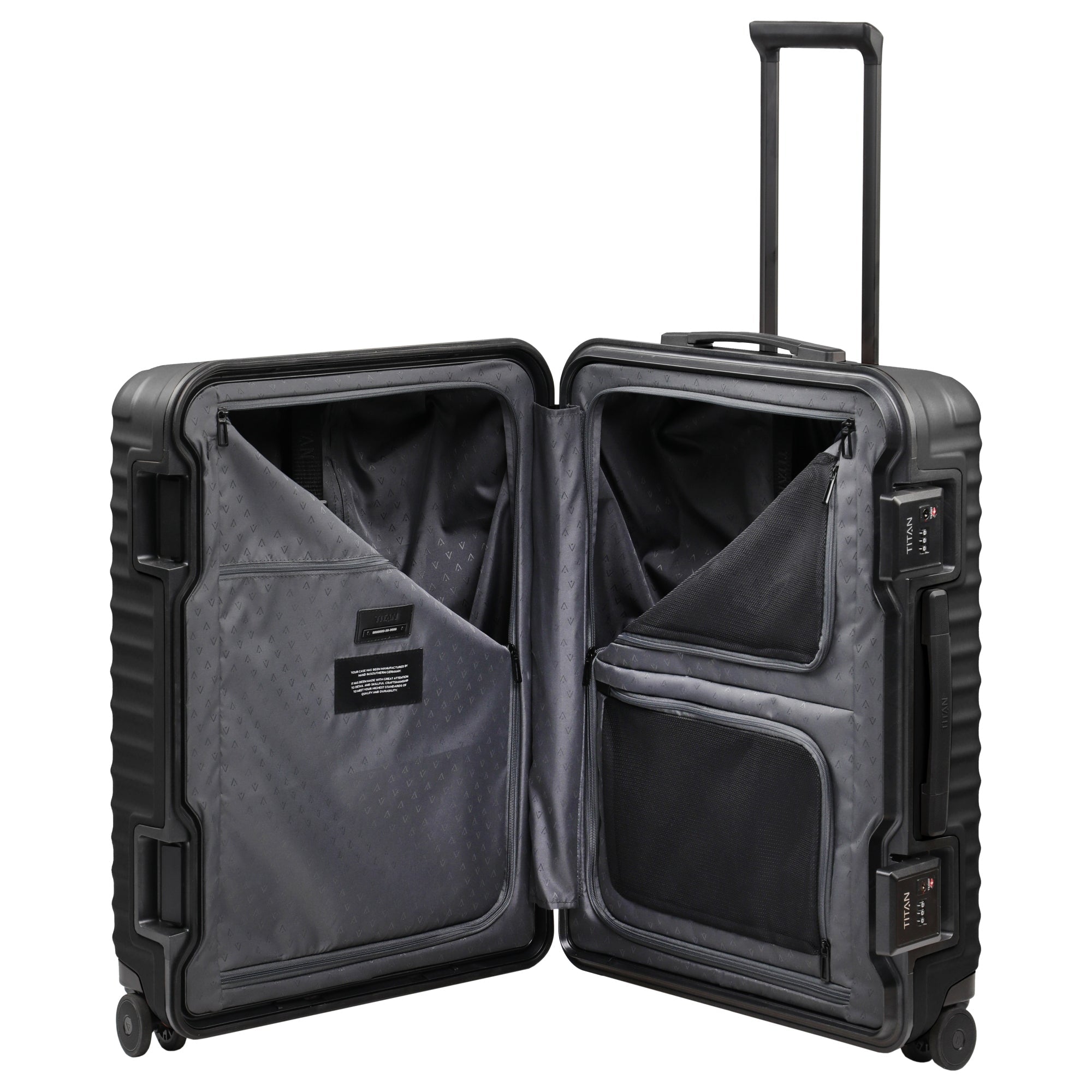 The TITAN OVERSEAS-4-Wheel Trolley M+ in elegant nightshade black is the perfect companion for trips up to seven days. With its generous capacity of 84 liters, it offers plenty of storage space for all your travel essentials. The durable polycarbonate exterior material reliably protects the suitcase from scratches and impacts, while the specially developed frame construction ensures maximum stability. Two oversized TSA locks guarantee top security during luggage checks. Thanks to the whisper-quiet 6 cm comfort wheels, the suitcase can be maneuvered effortlessly, even on uneven terrain. The smart interior layout with two dividers, mesh compartments, and Y-shaped packing straps ensures perfect organization. Practical ergonomic handles and the lockable lightweight metal telescopic handle make handling especially comfortable. With its modern design and high-quality features, the TITAN OVERSEAS M+ is the ideal choice for demanding travelers who value security, stability, and style.