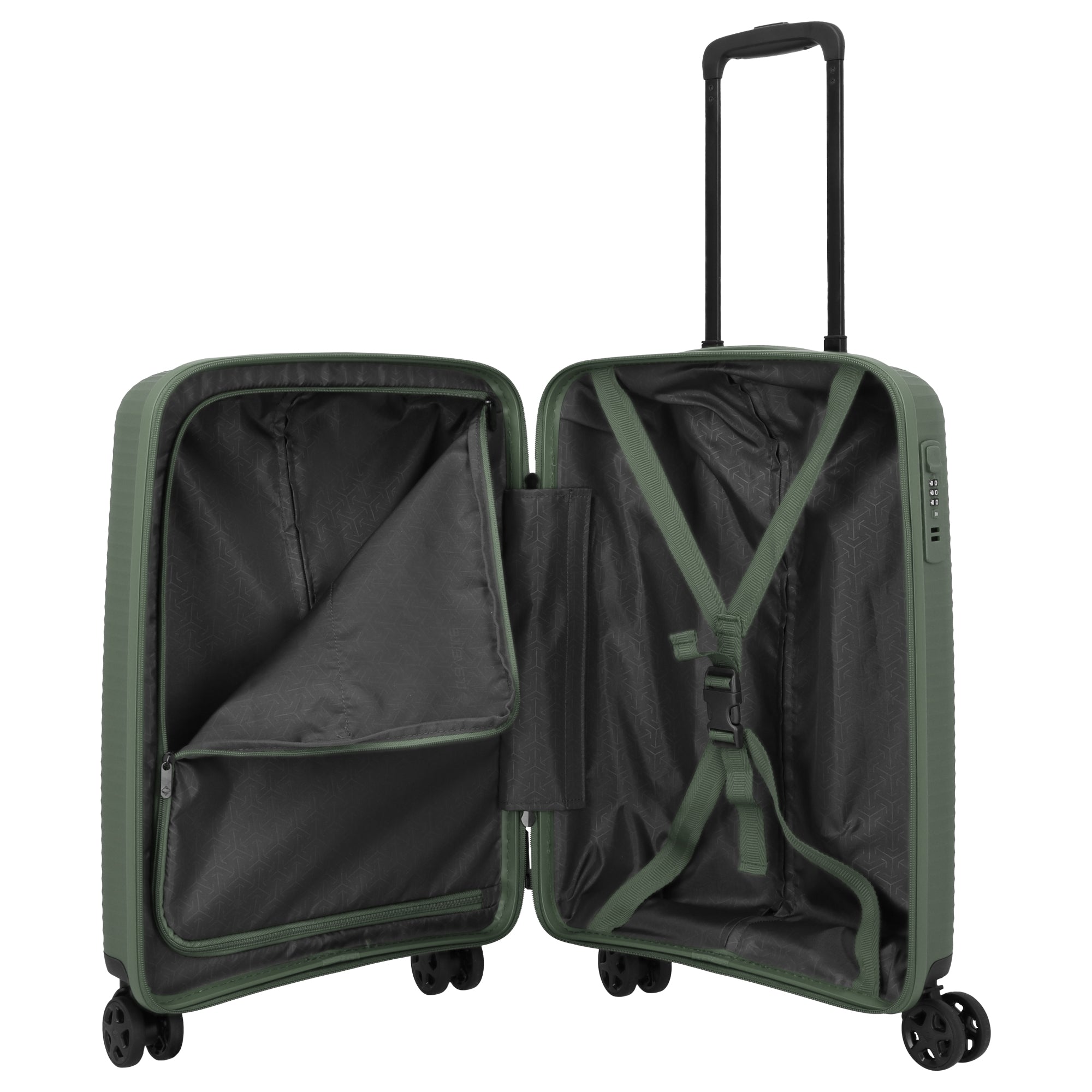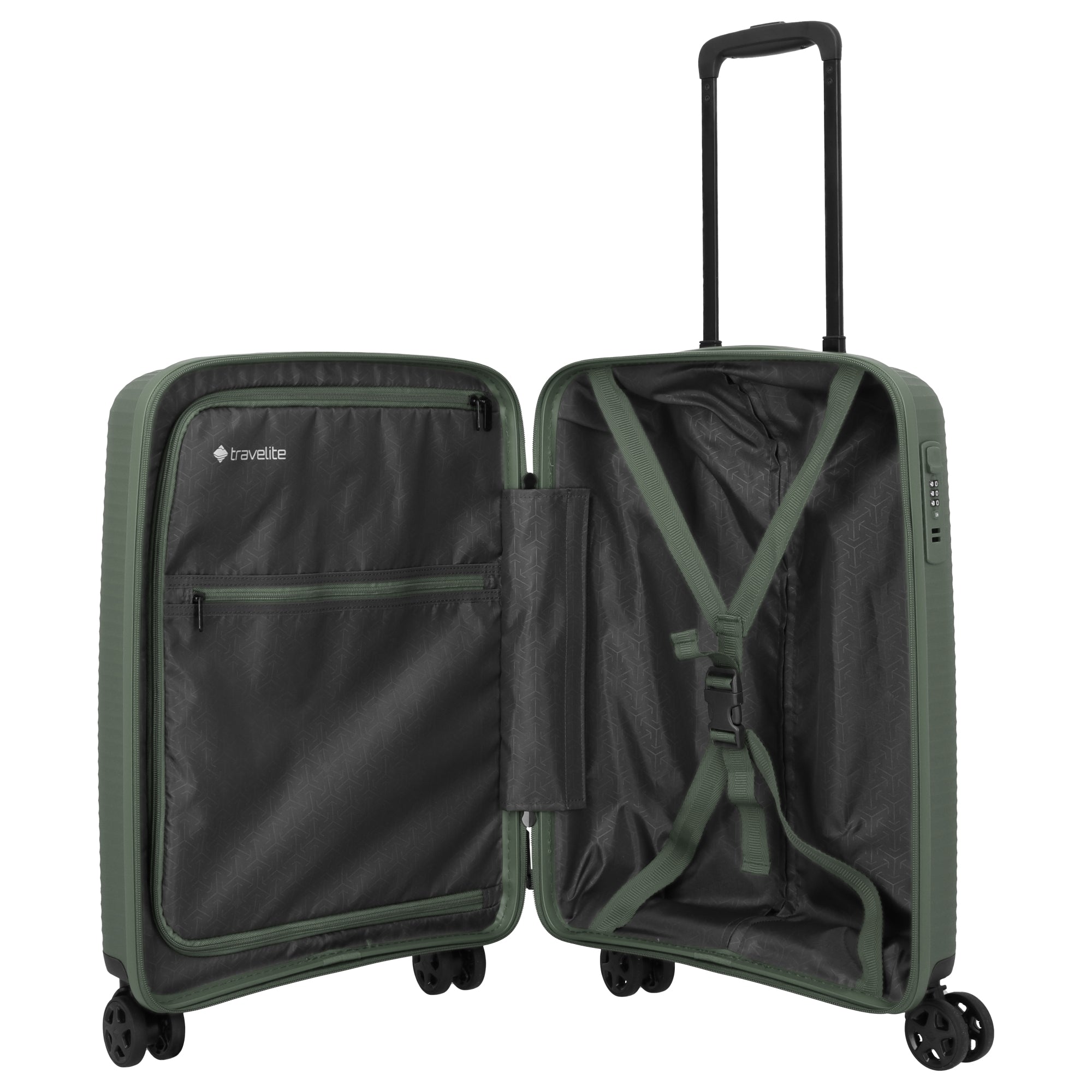 The Travelite Air Stripe 4-wheel cabin trolley in green is a lightweight and durable companion for short trips and business travel. Weighing only 2.3 kg, it offers a volume of 39 liters at a height of 55 cm, combining stability with flexible handling.