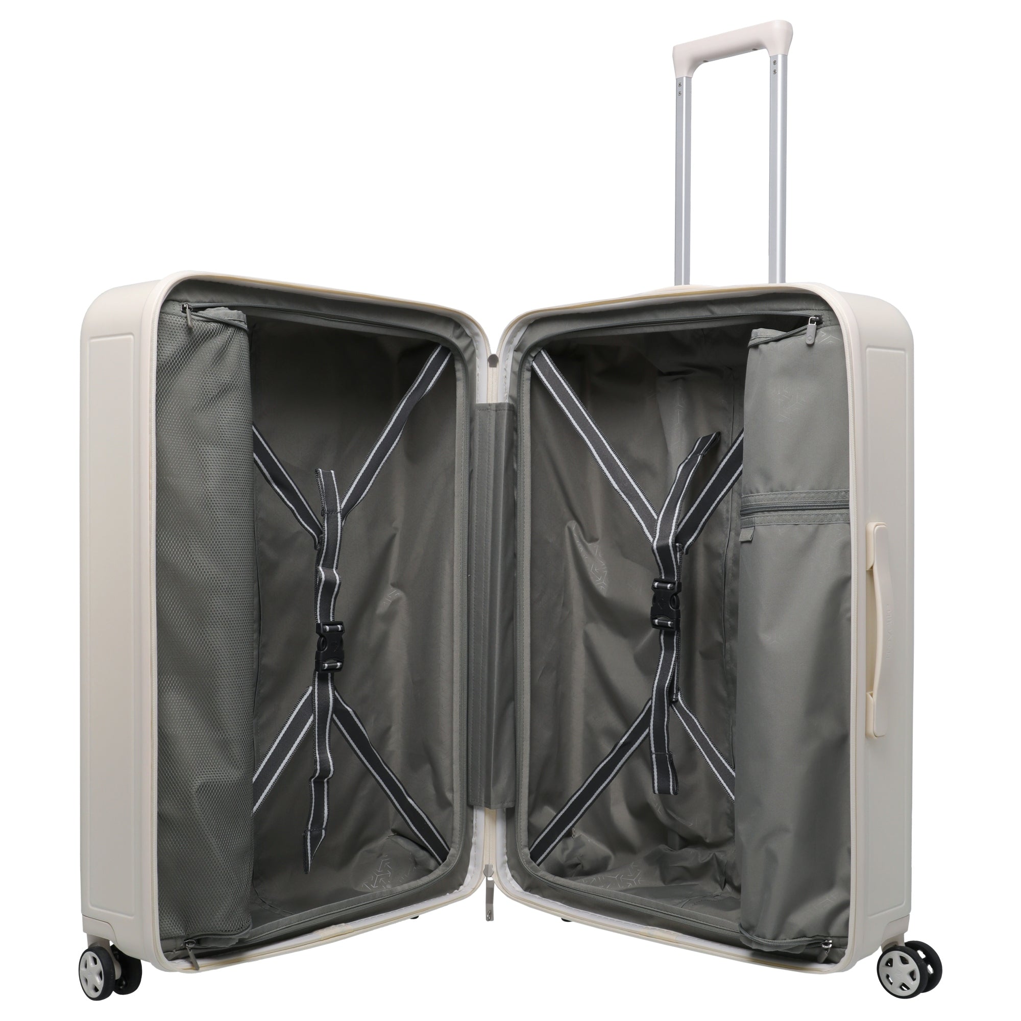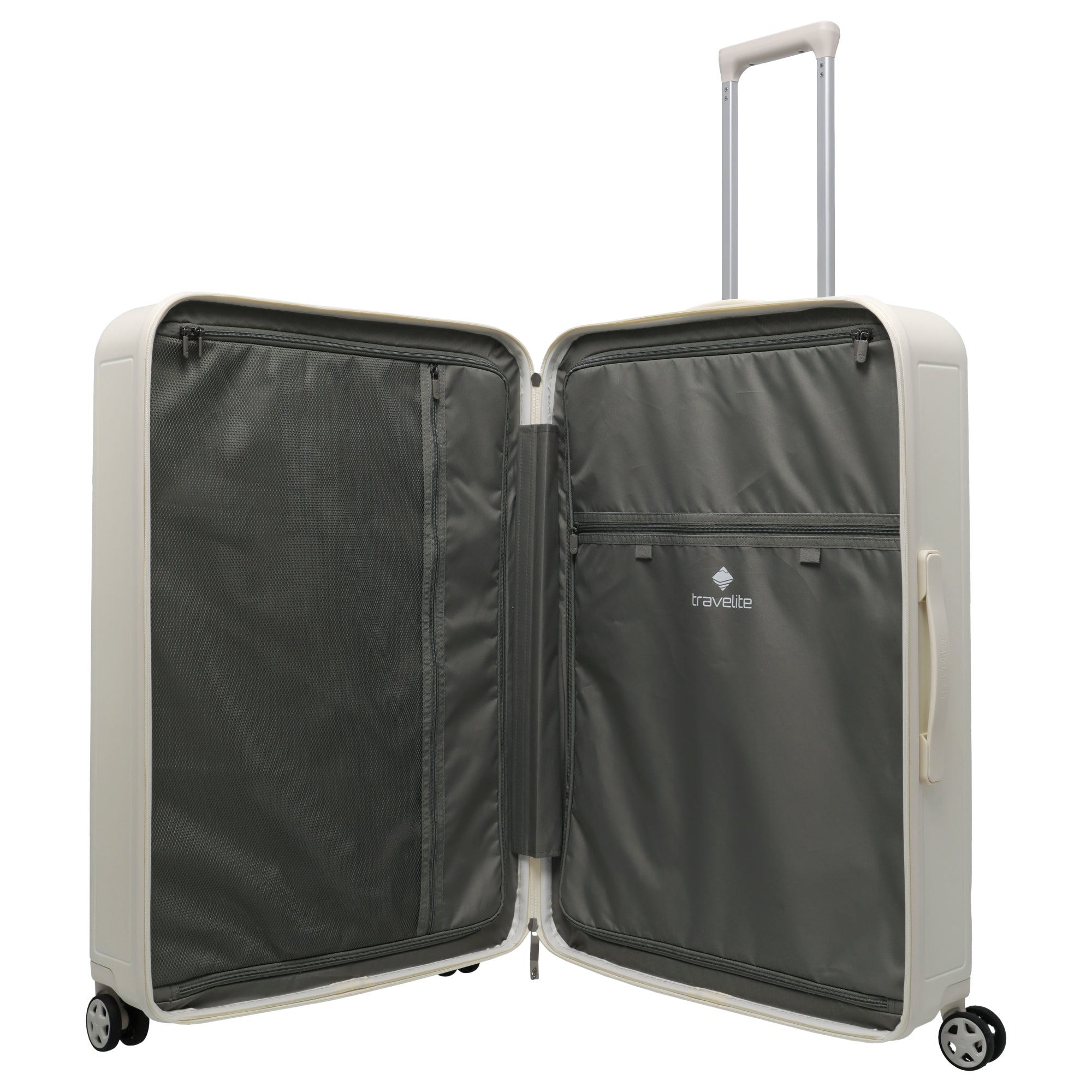 The Travelite Panello 4-wheel trolley in ivory is a functional companion for discerning travelers who value thoughtful design and practical details. With a height of 76 cm, it offers ample space for longer trips.