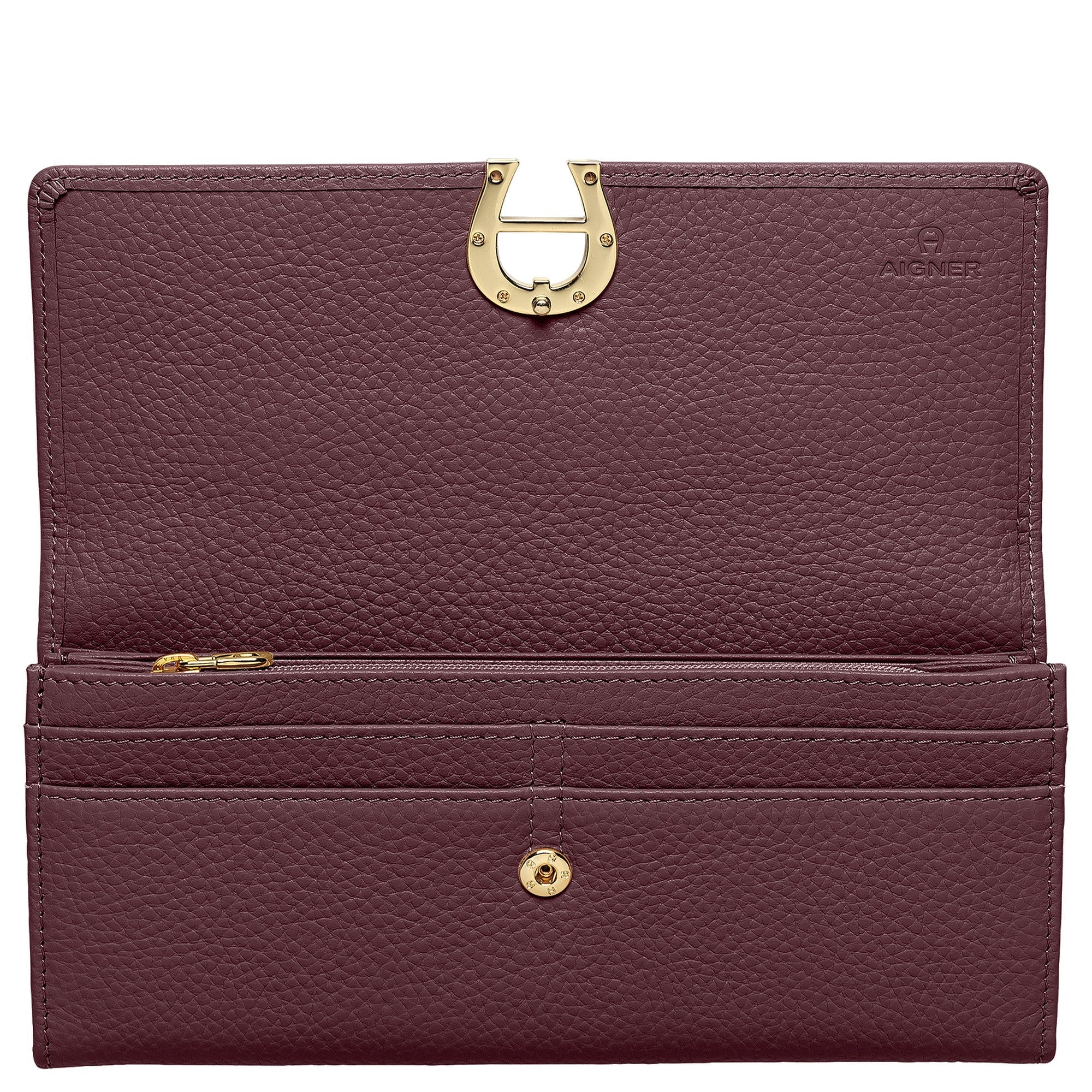 Eine elegante Geldbörse aus dem Hause Aigner, die durch ihr hochwertiges, port redfarbenes Leder besticht und stilvolle Akzente setzt.
