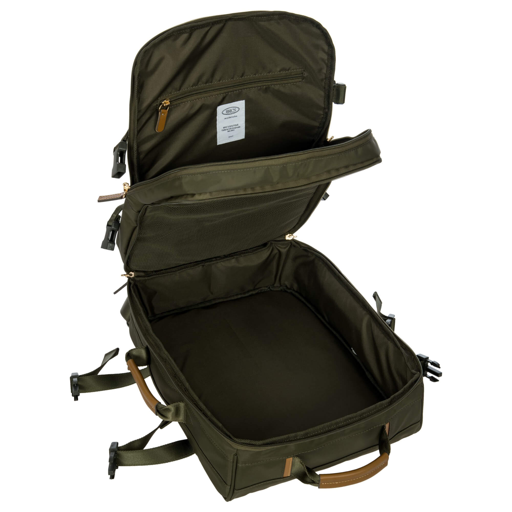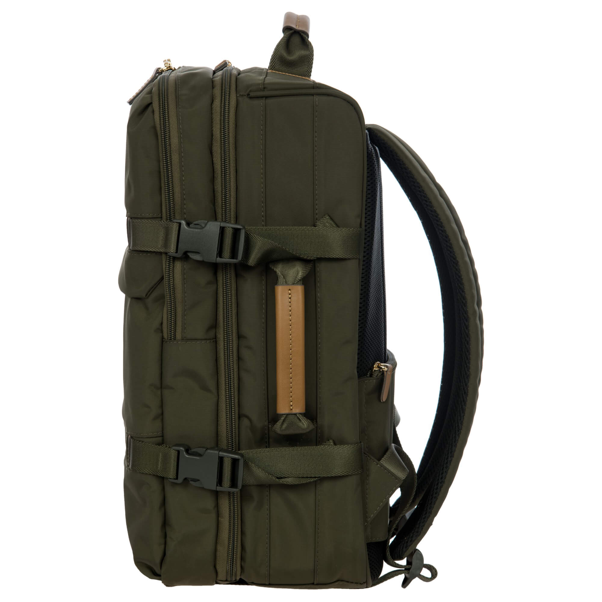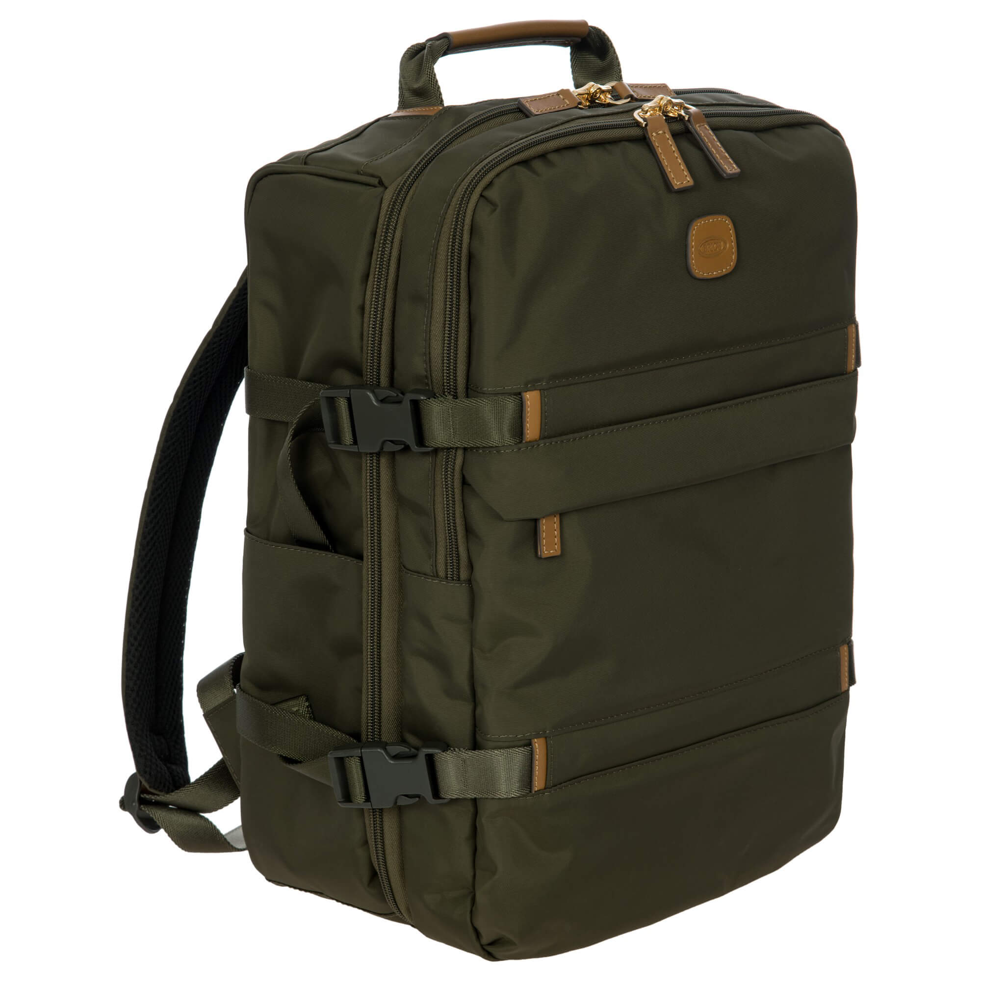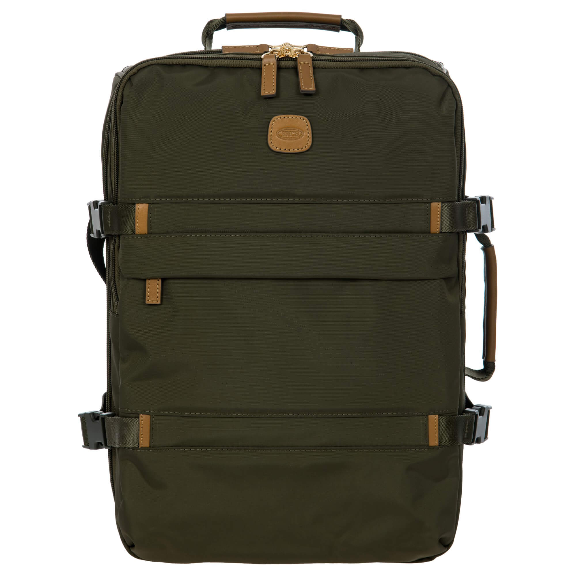 Ein technisch durchdachter Reiserucksack aus der X-Travel Kollektion von Bric's, der mit seinem satinierten Nylonmaterial und der olivgrünen Farbe einen robusten und funktionalen Eindruck macht.
