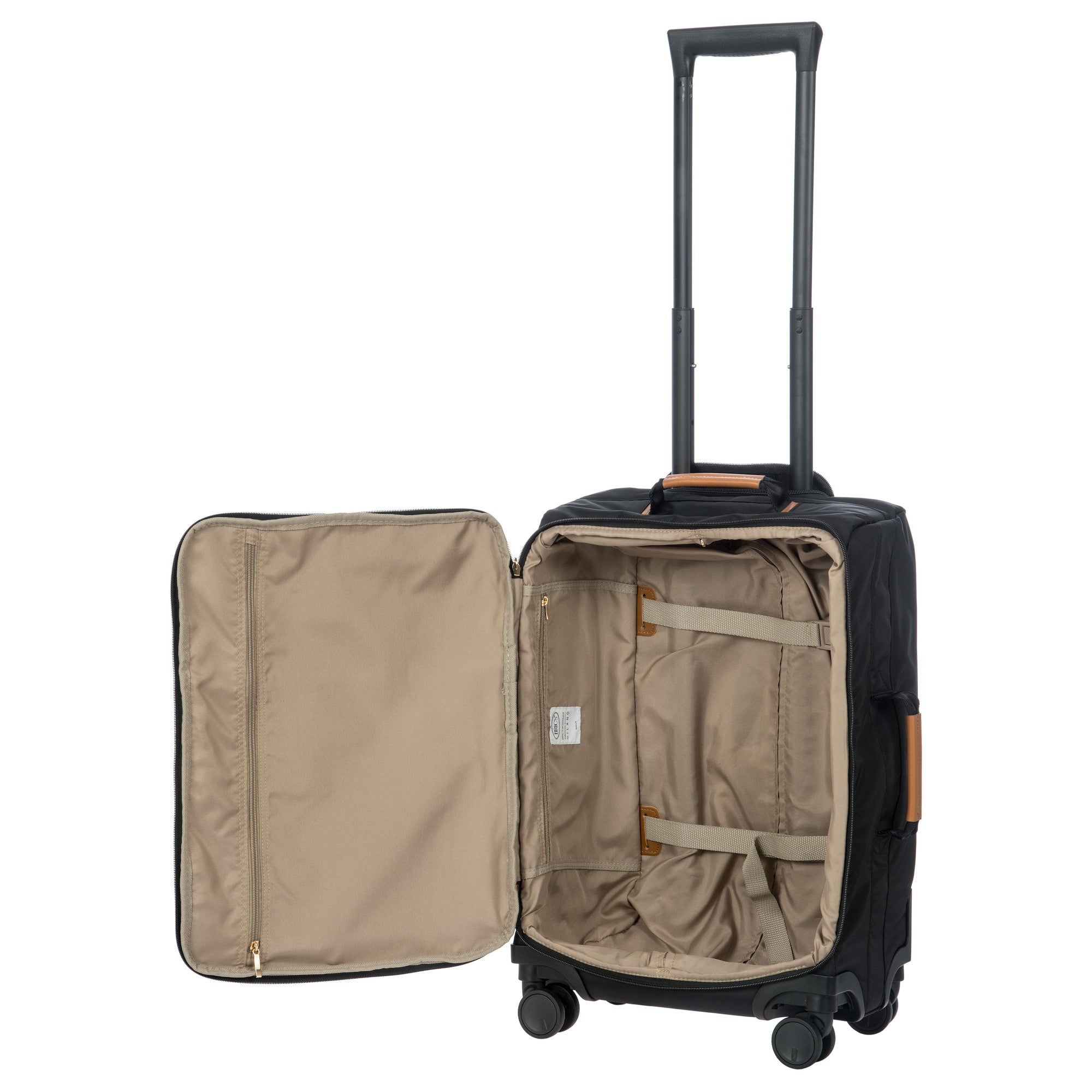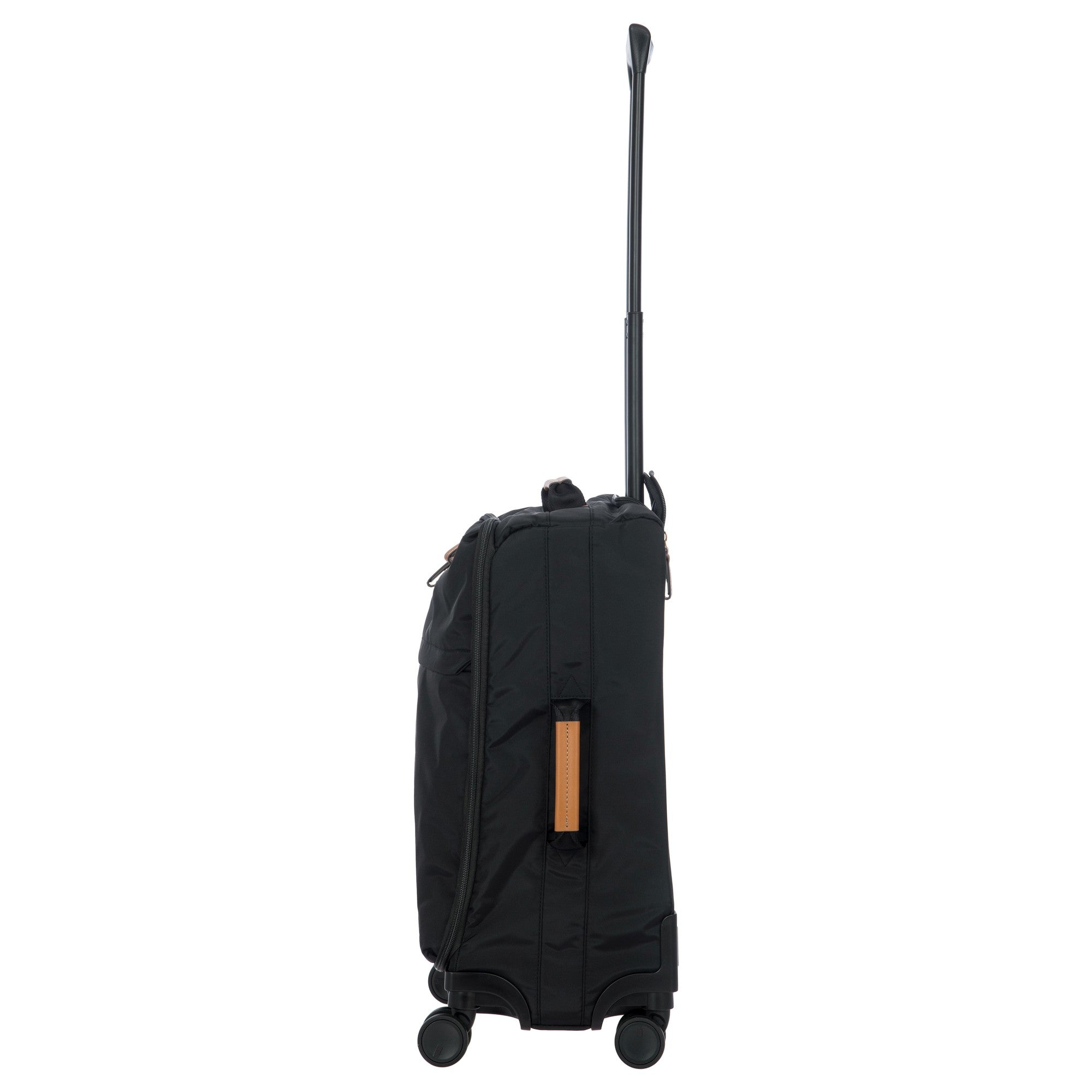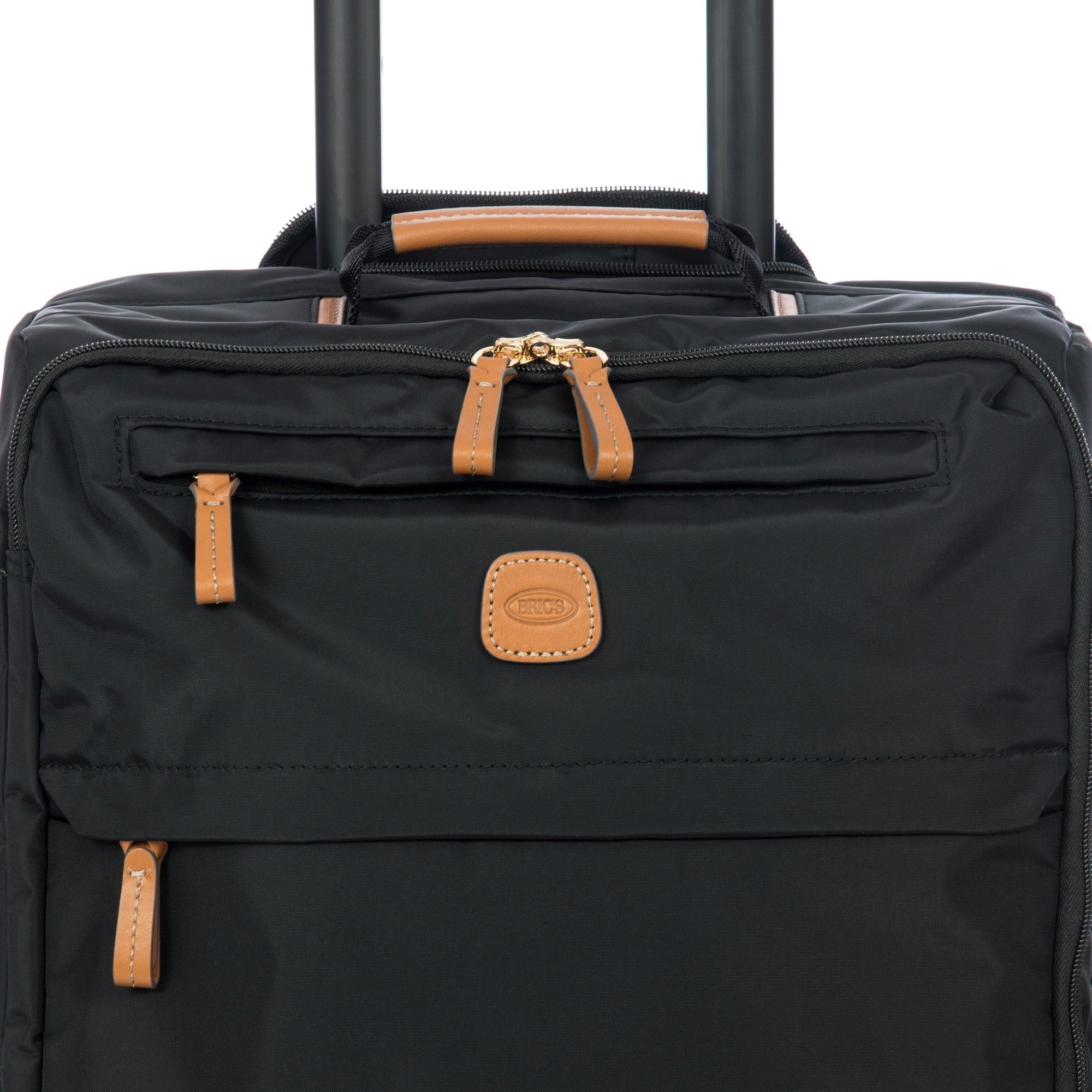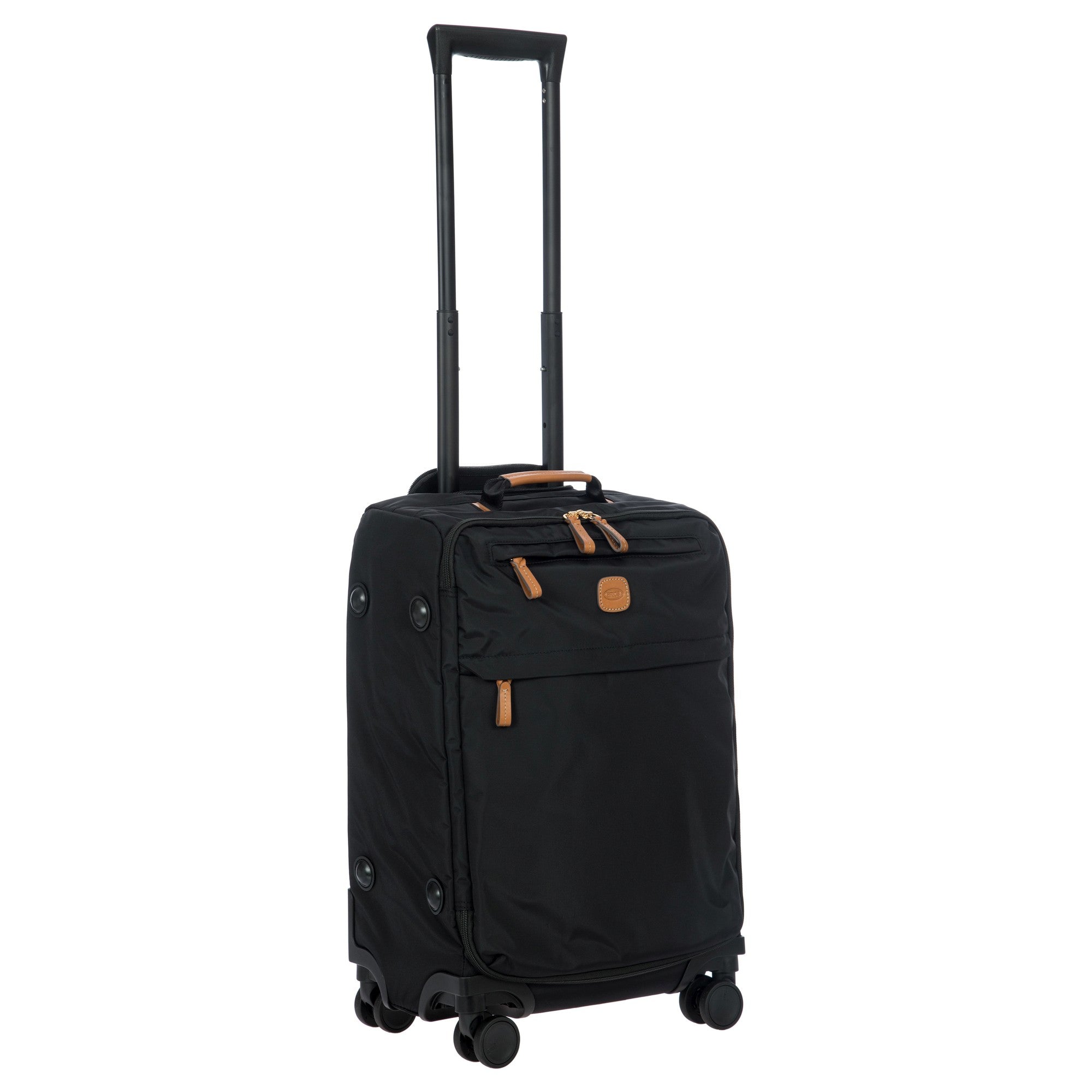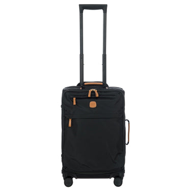 Ein robuster Kabinentrolley aus der Kollektion X-Travel von Brics, gefertigt aus satiniertem Nylon mit hochwertigen Lederdetails in klassischem Schwarz.