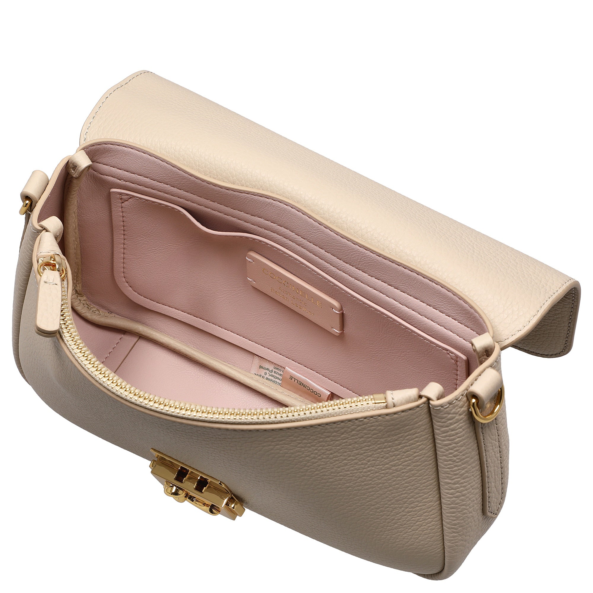 Die Coccinelle C-Me Lock Medium Schultertasche in elegantem sandshell ist ein modisches Statement für stilbewusste Frauen, die Wert auf Design und Alltagstauglichkeit legen.