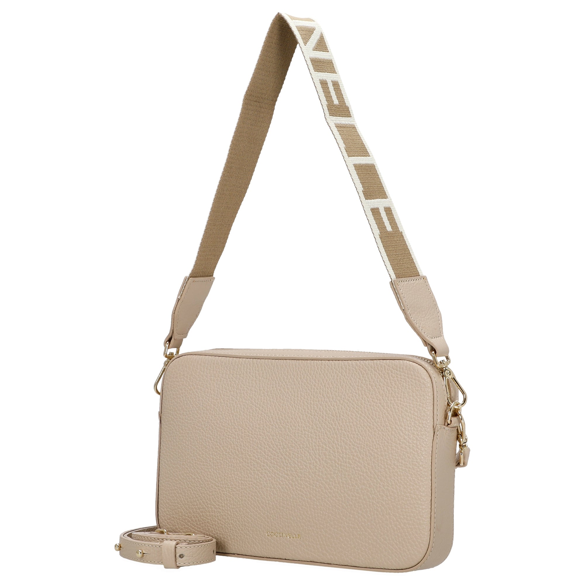Die Coccinelle Tebe Umhängetasche in elegantem sandshell ist ein modisches Accessoire für stilbewusste Frauen, die Wert auf hochwertige Details und vielseitige Tragemöglichkeiten legen.