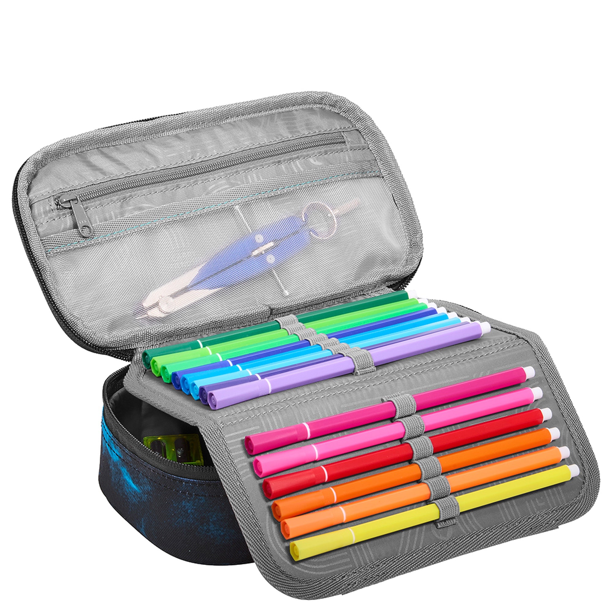 - Funktionale Aufteilung – inklusive Stiftehalter für bis zu 12 Stifte sowie separaten Fächern für Geodreieck und Zirkel