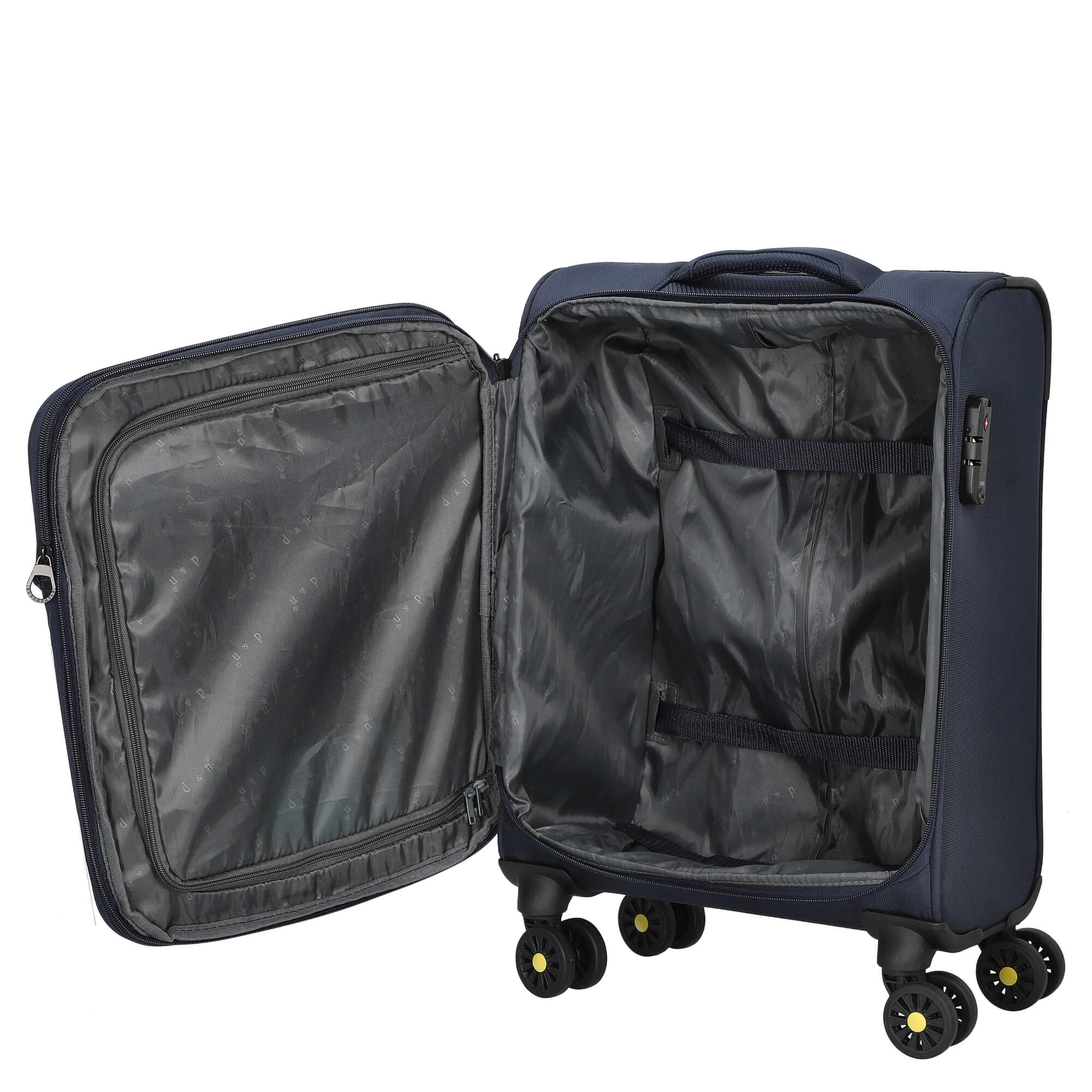 Entdecken Sie den D&N Travel Line 9704 - 4-Rollen-Kabinentrolley in der eleganten Farbe dunkelblau. Dieser handliche Trolley wurde aus strapazierfähigem Nylon gefertigt und bietet die perfekten Maße für Handgepäck, die von den meisten Fluggesellschaften akzeptiert werden. Mit einem durchdachten Design sorgt dieser Koffer dafür, dass Ihre Reiseutensilien stets optimal organisiert sind.