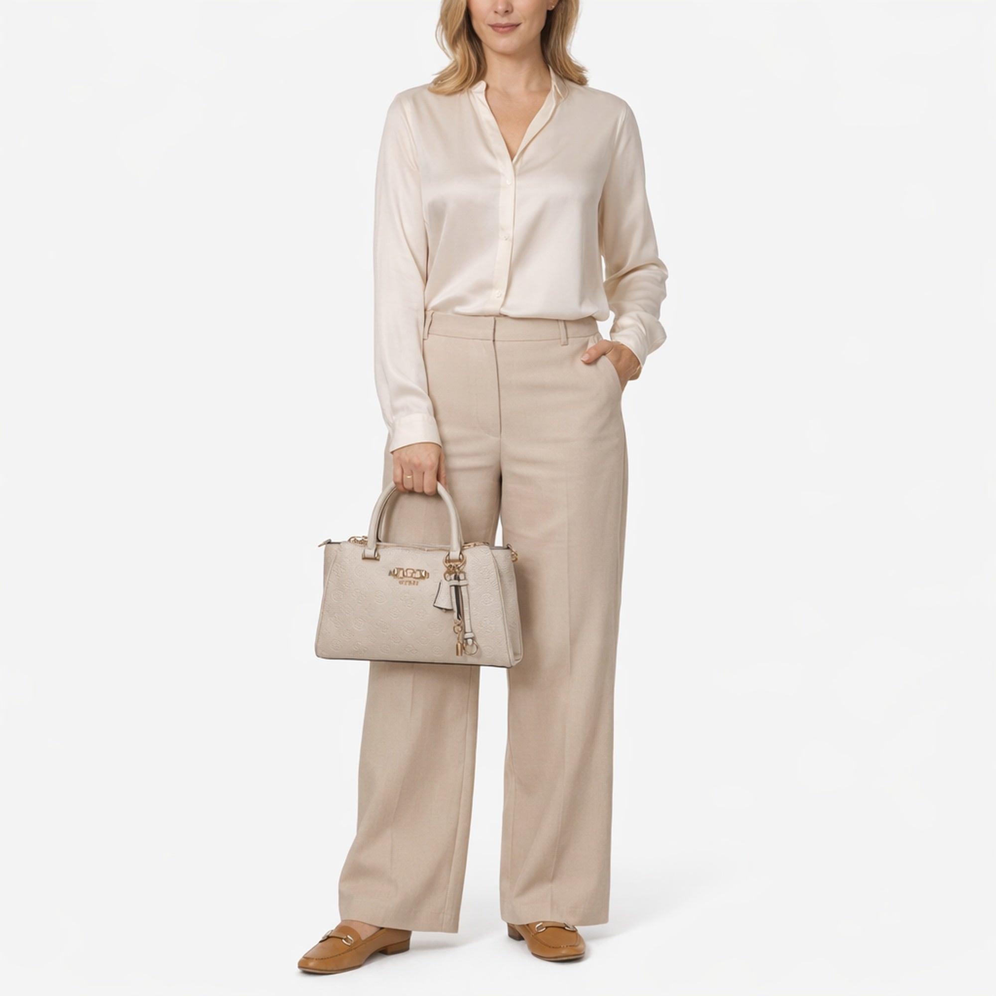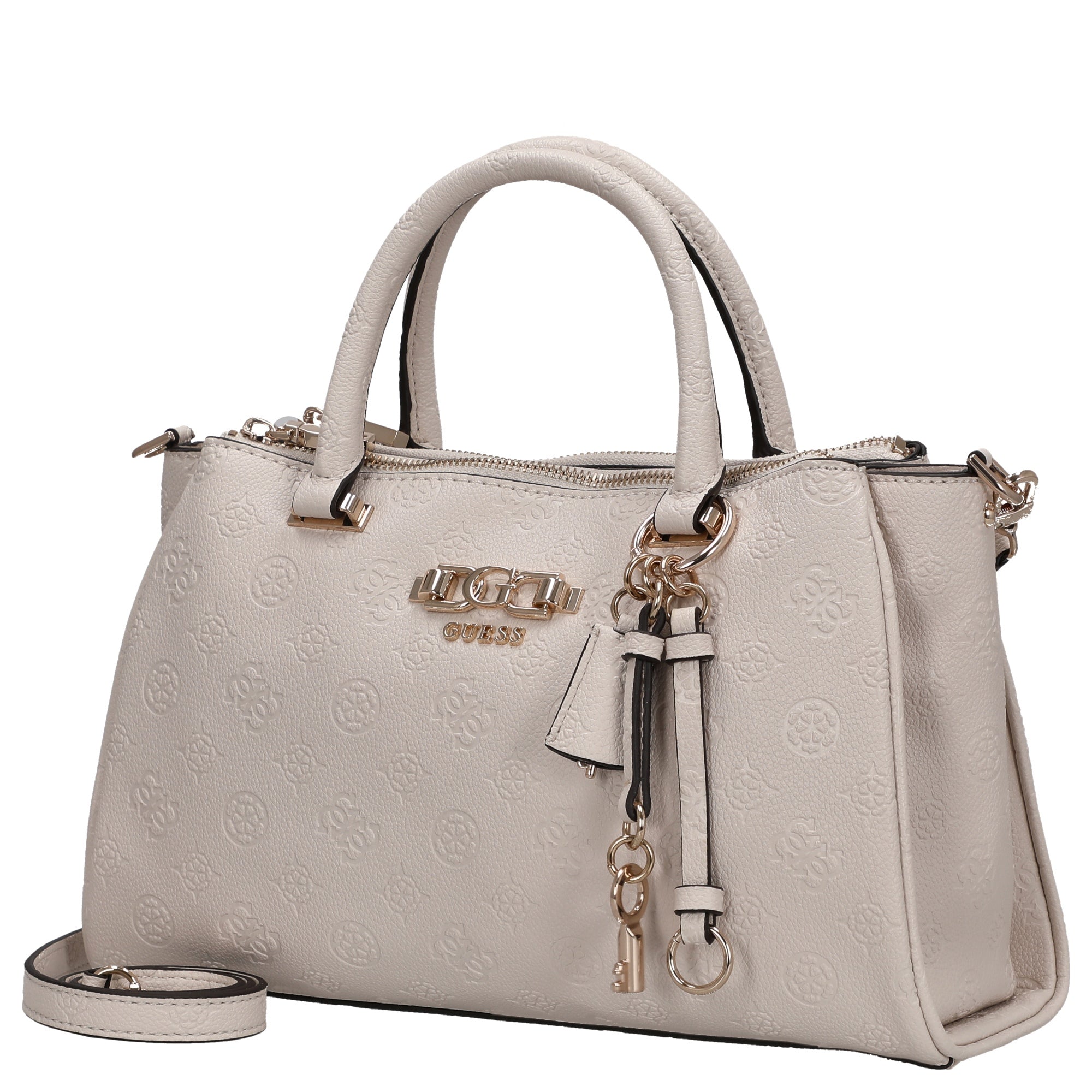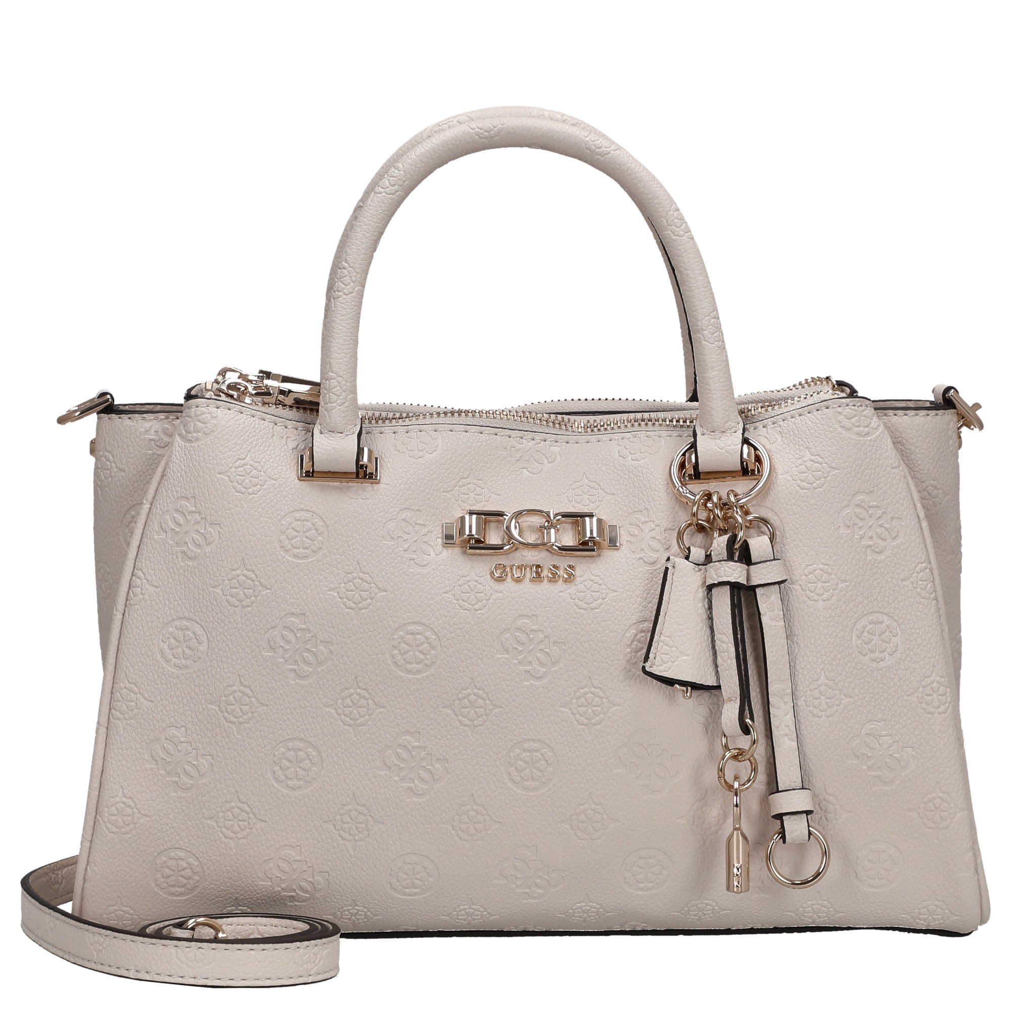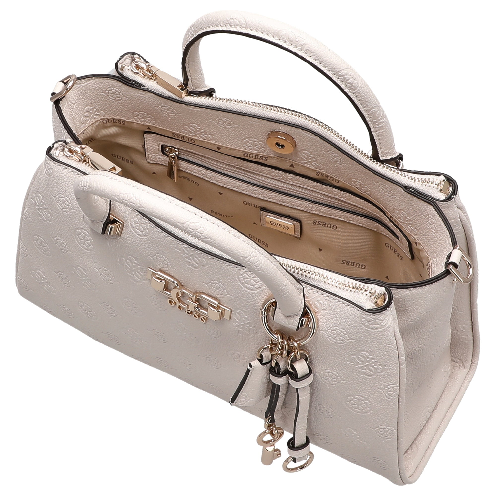 Eine stilvolle Handtasche, die modische Eleganz mit praktischer Alltagstauglichkeit verbindet. Die Guess Anise Triple Comp Satchel in der Farbe stone logo besticht durch ihr klares Design und hochwertige Details, die jeden Look veredeln.