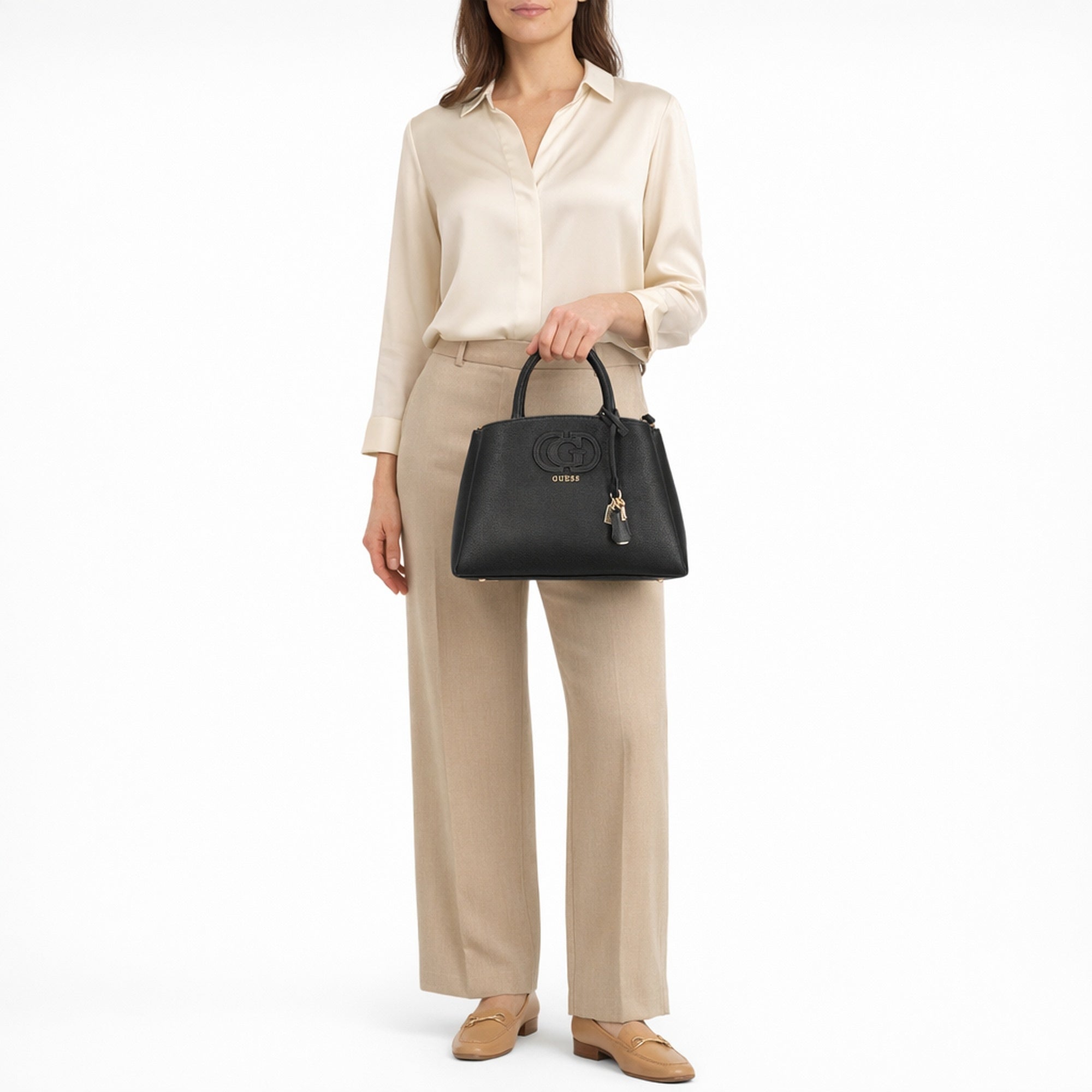 Eine stilvolle Begleiterin für modebewusste Frauen, die Wert auf elegantes Design und praktische Details legen. Die GUESS Isola 3 Comp Satchel besticht durch ihre klassische schwarze Farbe und hochwertige Verarbeitung, die jedem Outfit eine feminine Note verleiht.
