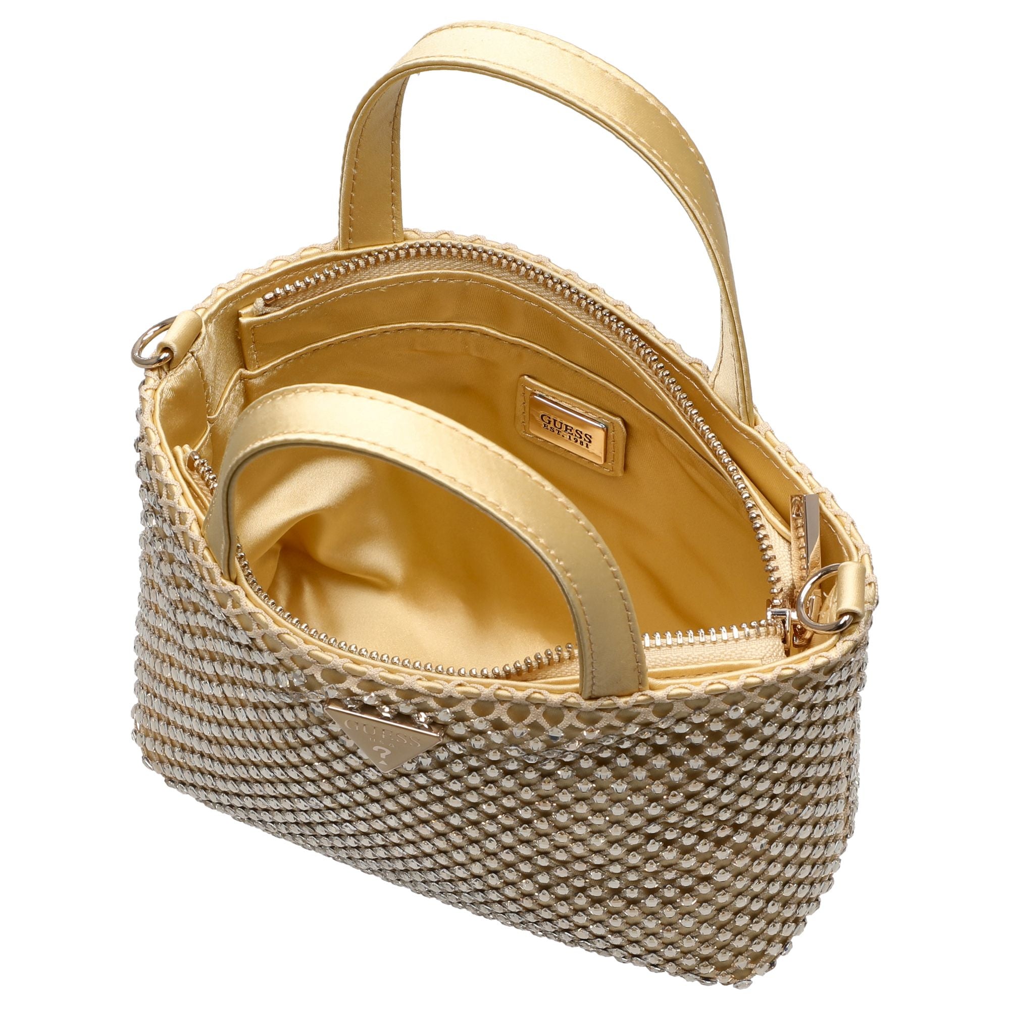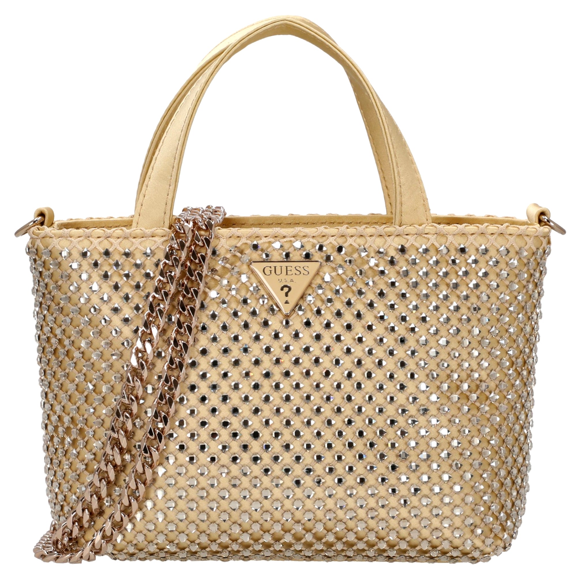 Die Guess Tasmin Mini ist eine elegante Henkeltasche in strahlendem Gold, die modische Akzente setzt und vielseitig kombinierbar ist.