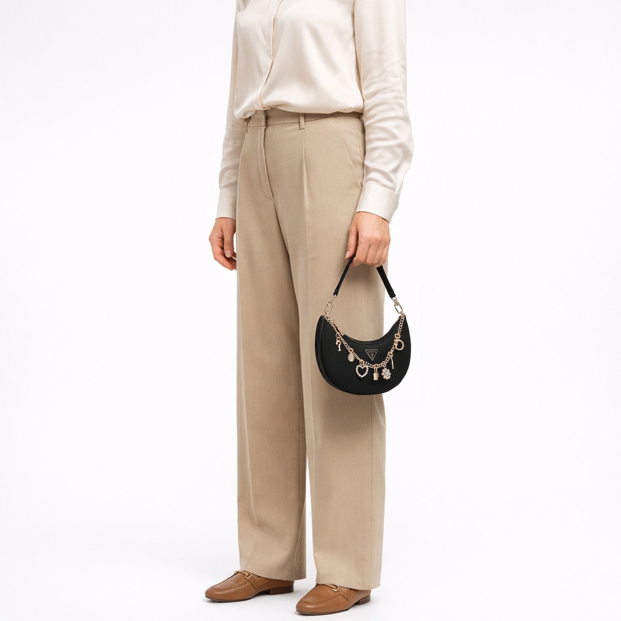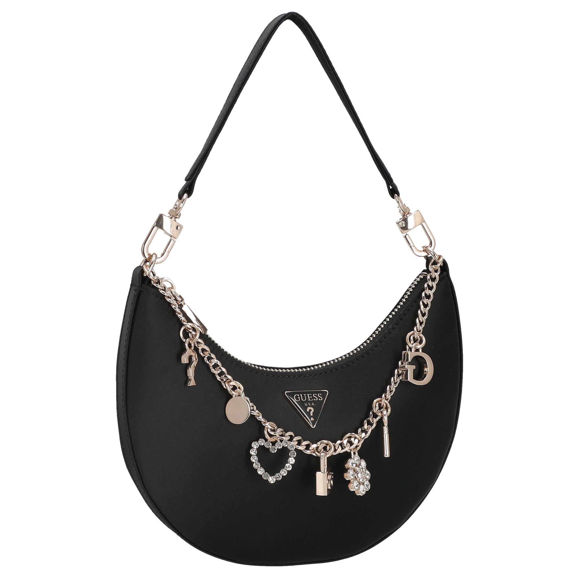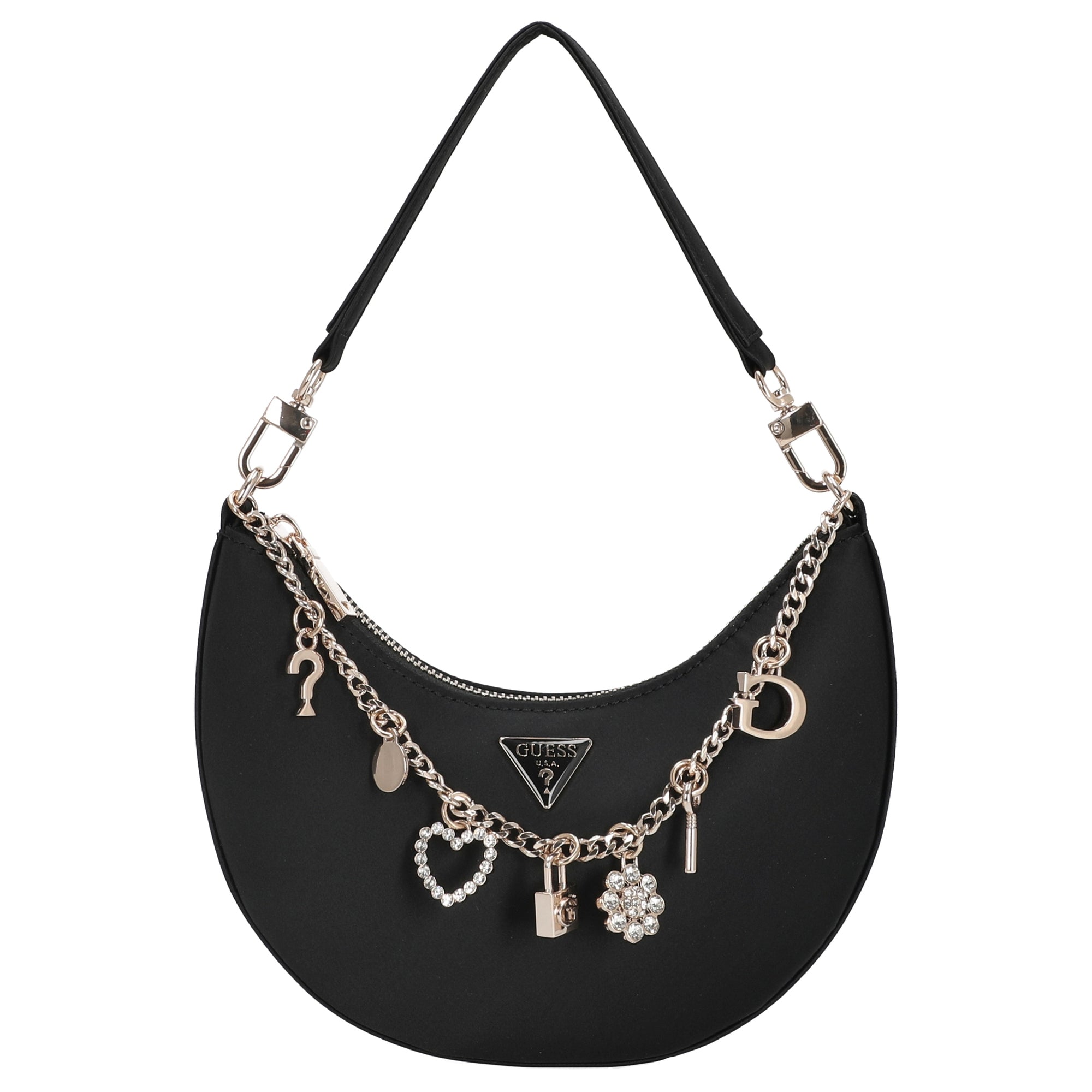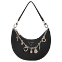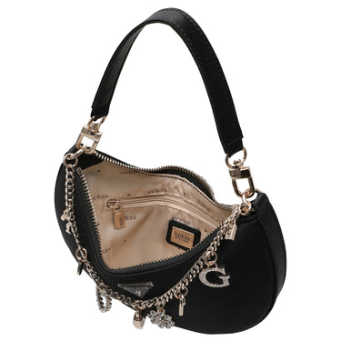 Eine elegante Schultertasche von GUESS, die modischen Stil und praktische Alltagstauglichkeit harmonisch verbindet. Die schwarze Farbe und das zeitlose Design mit einer feinen Zierkette setzen feminine Akzente und verleihen jedem Outfit einen dezenten Glamour.