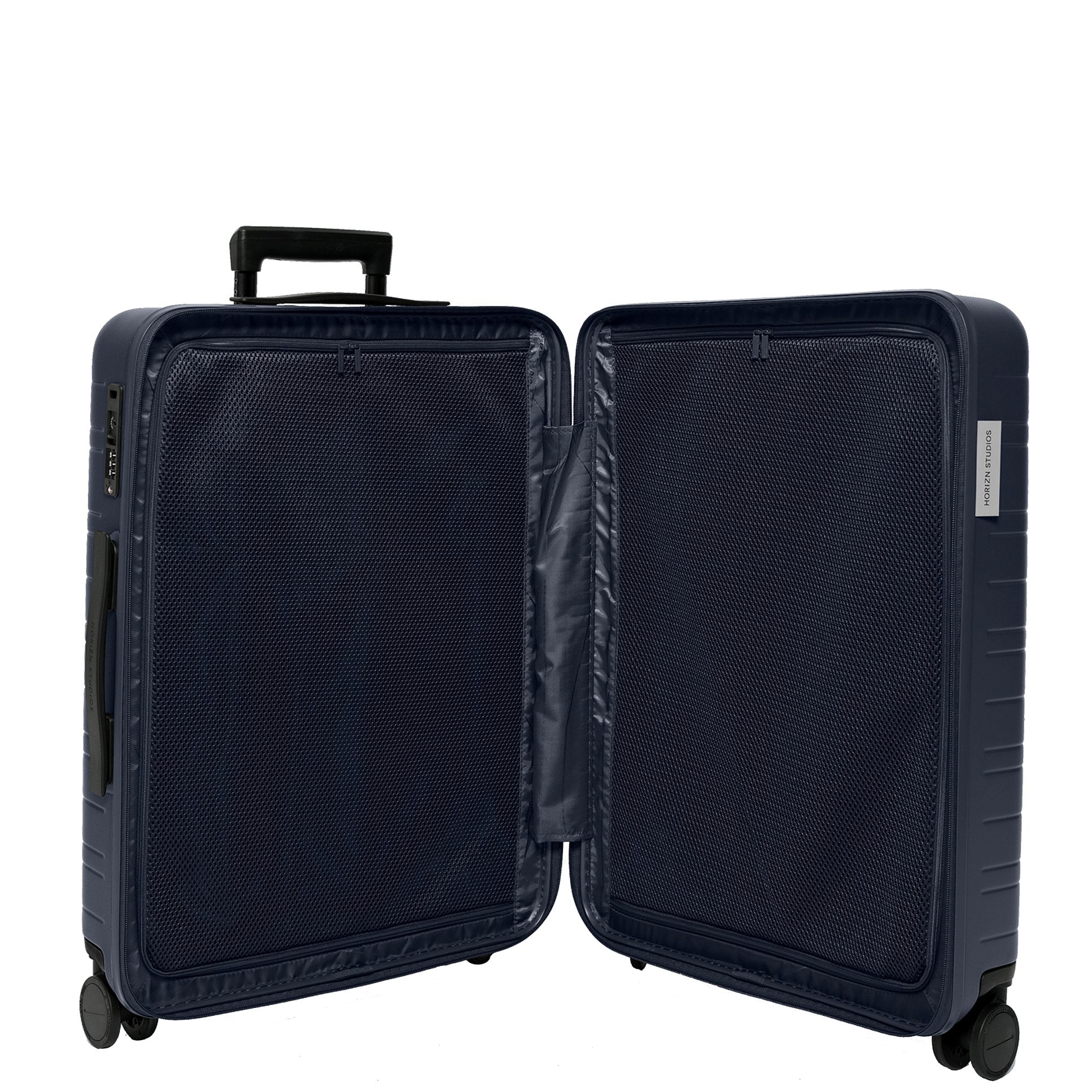 Entdecke den Horizn Studios H6 Essential Check In, einen stilvollen 4-Rollen-Trolley in der eleganten Farbe night blue. Dieser nachhaltige Reisebegleiter ist nicht nur ein echter Blickfang, sondern auch praktisch für Reisen von bis zu zwei Wochen.