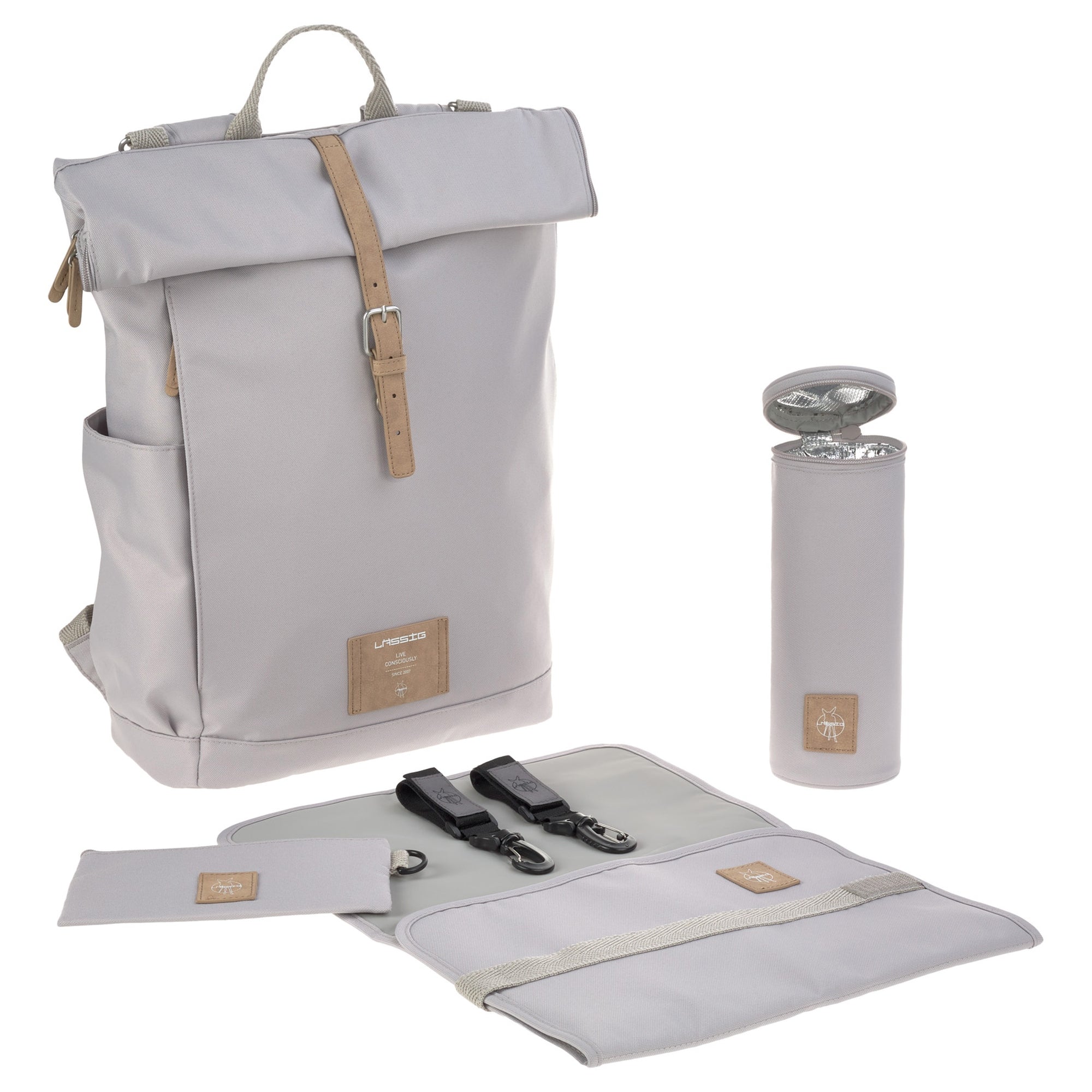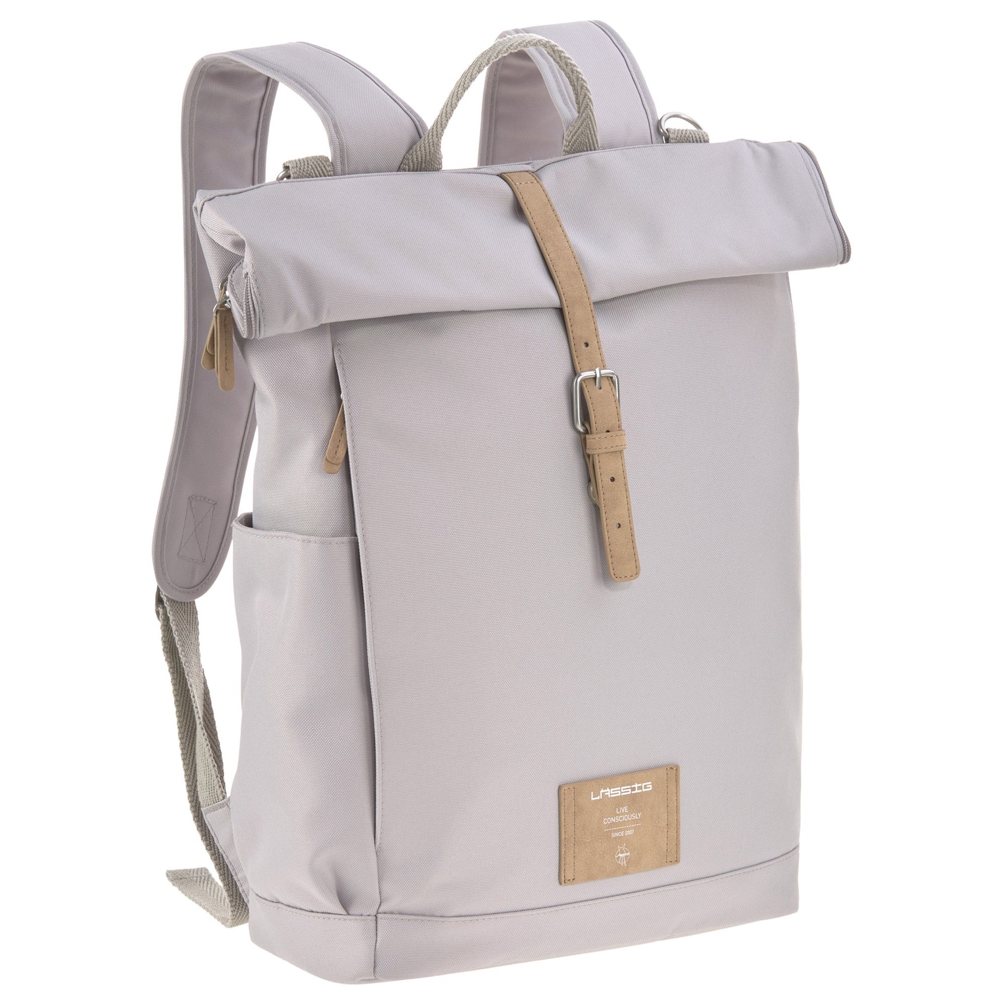 Entdecken Sie den Lässig Green Label Rolltop Wickelrucksack in der eleganten Farbe Grau. Dieser stilvolle Rucksack aus der Green Label-Kollektion kombiniert modernes Design mit durchdachter Funktionalität, ideal für trendbewusste Eltern.