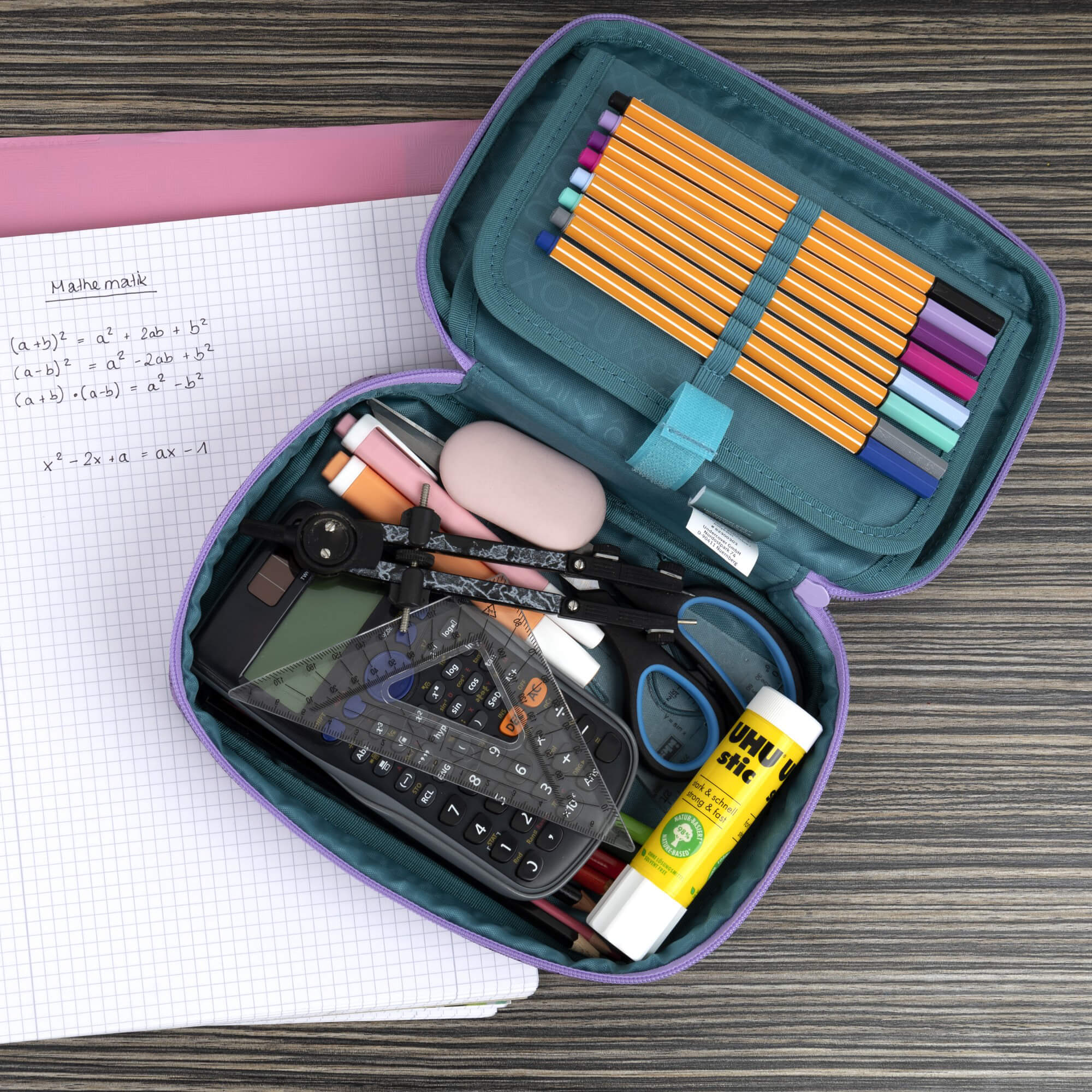 - Geräumiges Hauptfach – bietet ausreichend Platz für Geodreieck, Kleber und weitere Schreibutensilien