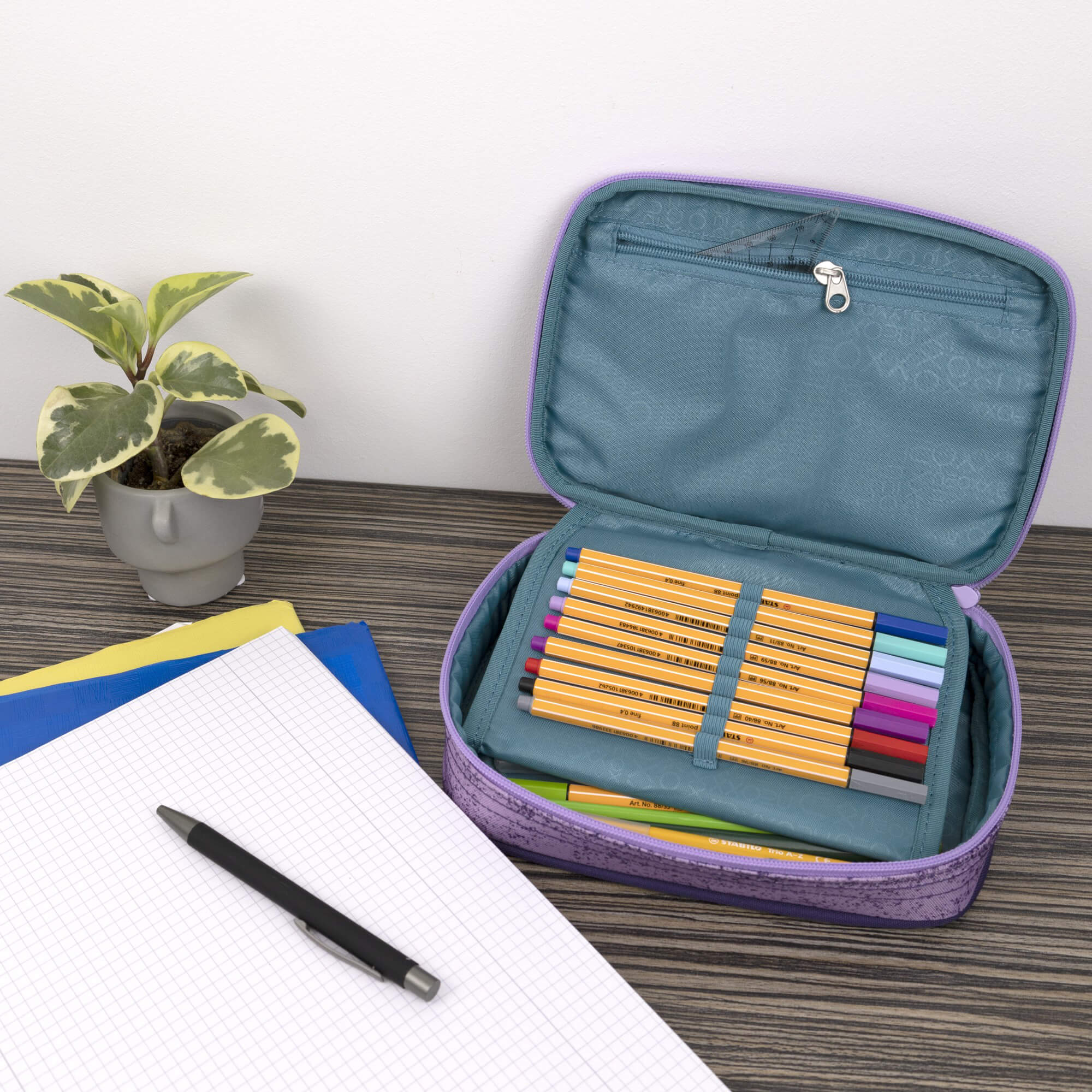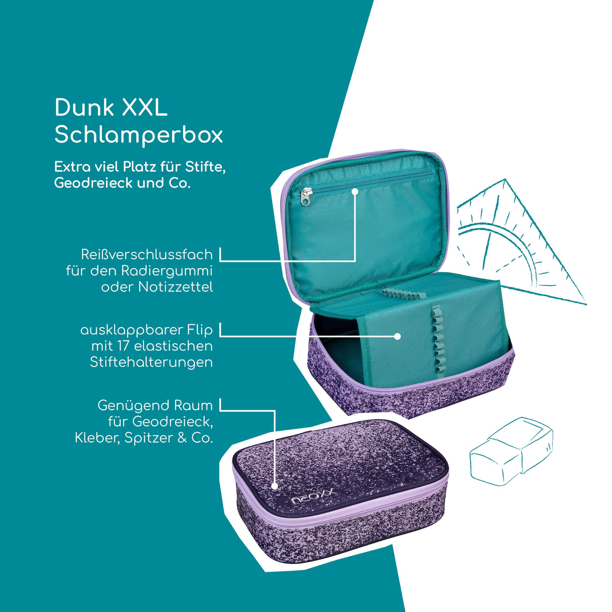 Das Neoxx DUNK Schlampermäppchen XXL überzeugt mit seiner großzügigen Aufteilung und einem modernen Design in Lilatönen. Dieses Mäppchen ist ideal für Schüler, die ihre Stifte und Schulutensilien ordentlich und griffbereit verstauen möchten.