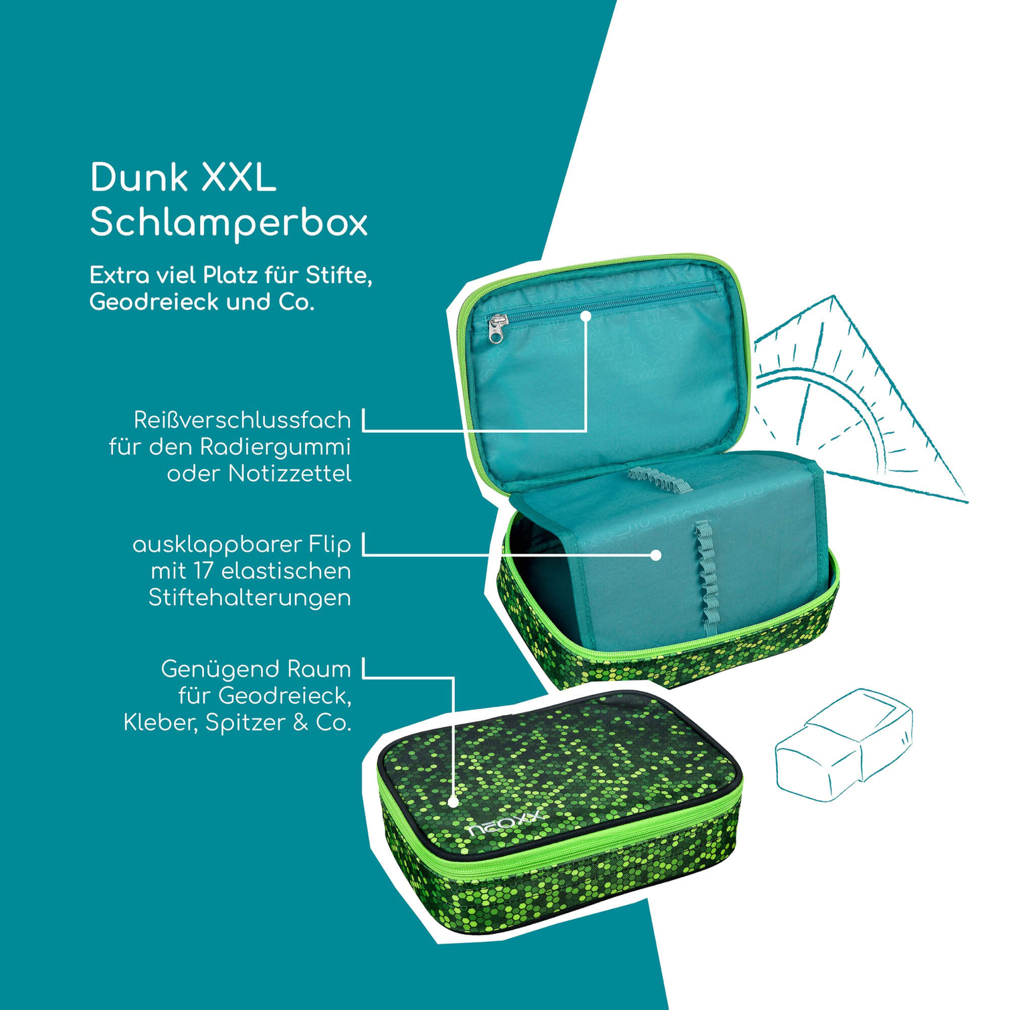 Das geräumige Schlampermäppchen XXL DUNK von Neoxx bietet Schülern eine praktische Möglichkeit, Stifte und Schulutensilien übersichtlich zu verstauen. Das auffällige Design in Grün mit Pixelmuster sorgt für einen modernen Look im Schulalltag.
