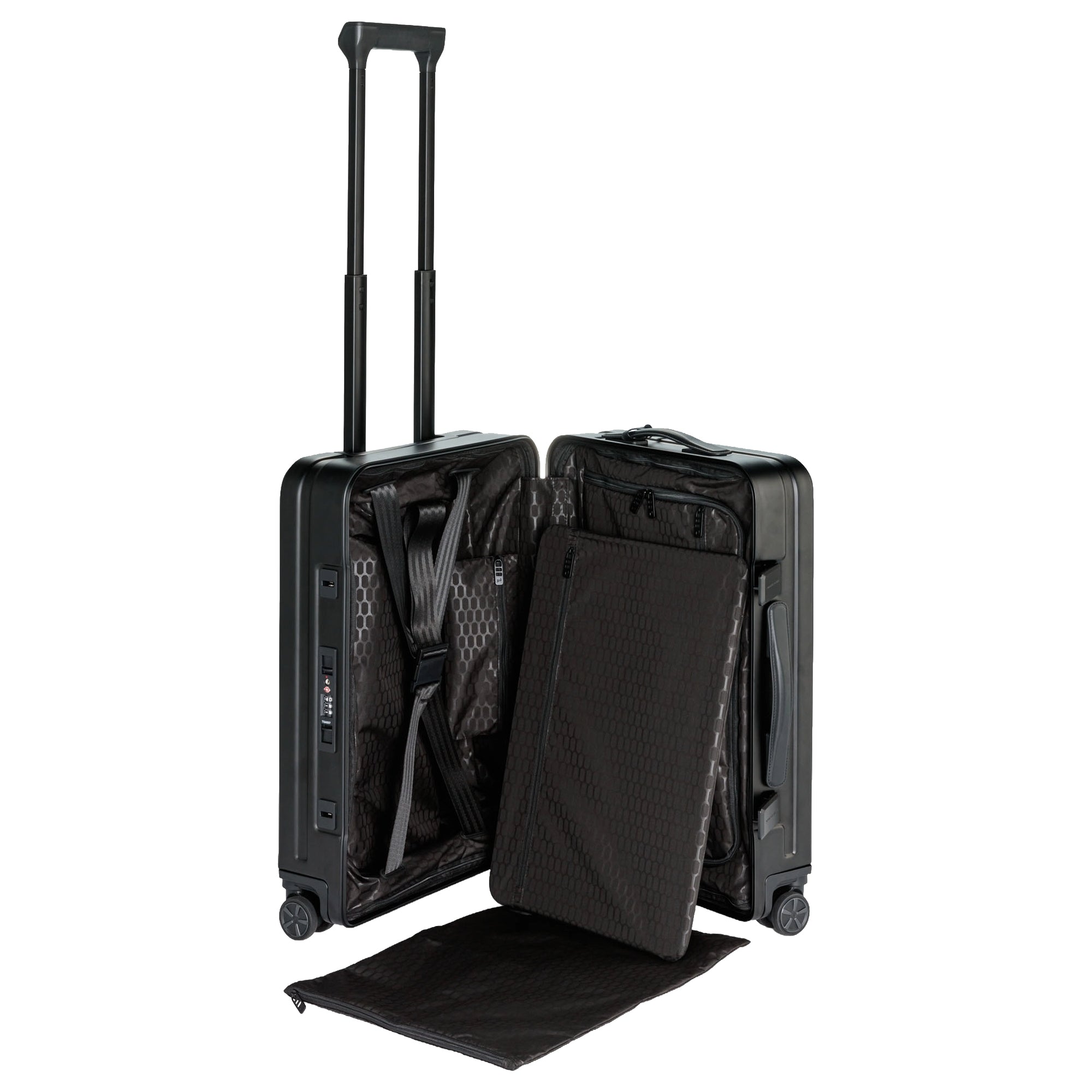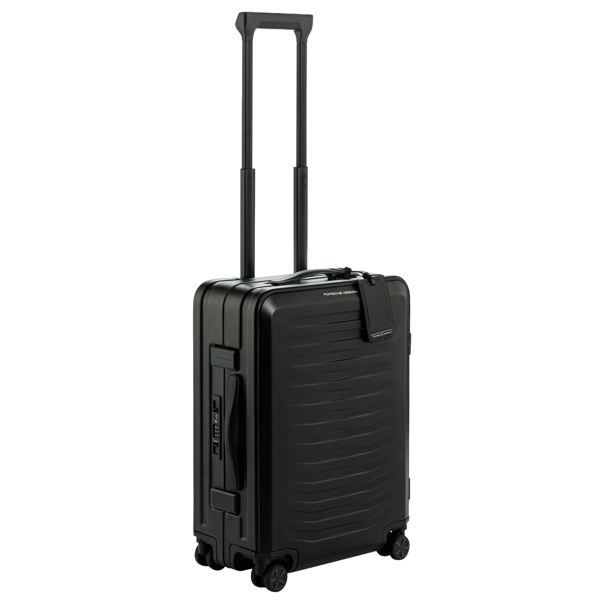 Der Porsche Design Roadster Aluminium Kabinentrolley S verbindet innovative Technik mit dem charakteristischen Design der Marke. Mit seinem leichten, eloxierten Aluminiumgehäuse bietet er eine robuste und stilvolle Lösung für Geschäfts- und Urlaubsreisen. Das elegante schwarze Äußere zeigt den unverwechselbaren Porsche DNA-Look, inspiriert von der aerodynamischen Form des 911.