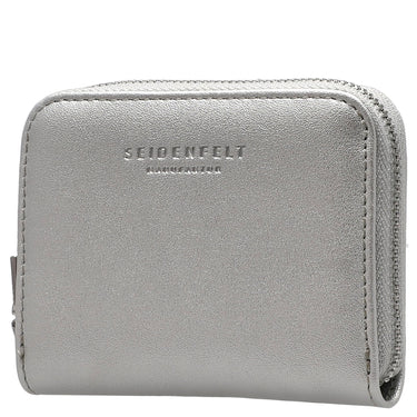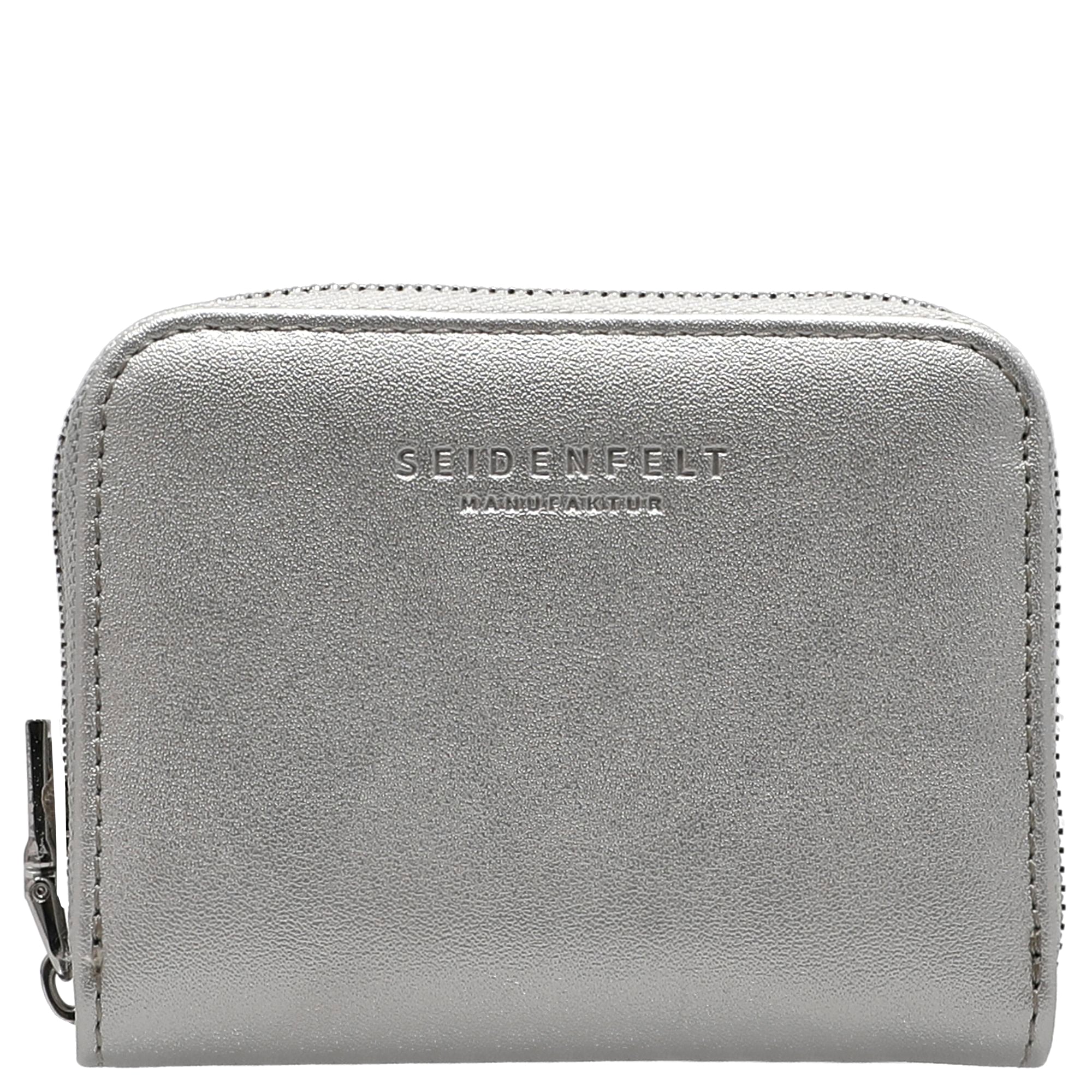Eine kompakte Geldbörse von SEIDENFELT MANUFAKTUR in elegantem silberfarbenem Design, die sich mühelos in jeder Hand- oder Hosentasche verstauen lässt.