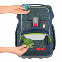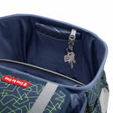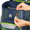 Das Set in grünem geometrischem Muster umfasst zusätzlich Turnbeutel, Schlamperetui und unbestücktes Mäppchen – ideal für einen organisierten und sicheren Schulalltag.
