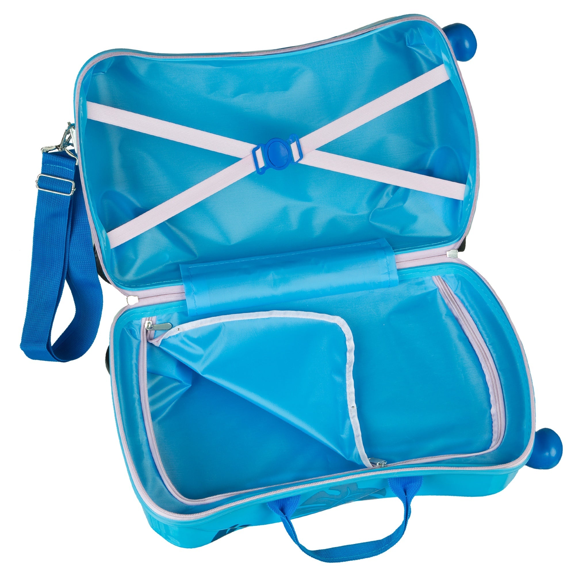 Der blaue Kindertrolley ist ideal für Familienurlaube und kurze Reisen, bei denen Funktionalität und kindgerechte Features im Vordergrund stehen.